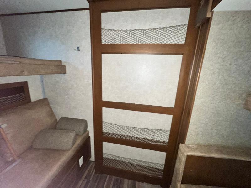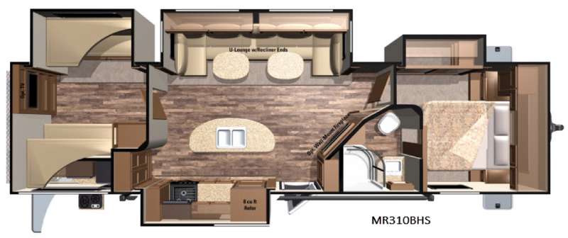 This Mesa Ridge travel trailer MR310BHS features quad slides, a private bunkhouse that the kids or guests will love, a kitchen island, and an outside kitchen too!