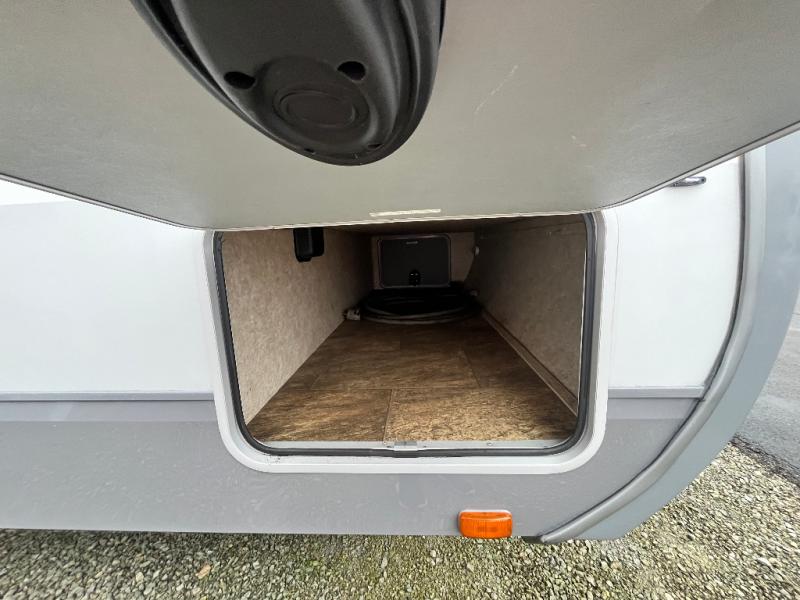 The private rear bunkhouse is a great place for the kids or guests to call their own. They can sleep comfortably on the sofa with bunk above on the left or opposite in the slide out dinette below an upper bunk. They may also enjoy playing games on the dinette and relaxing on the sofa while watching the optional TV along the rear wall, plus they have a place to stow their toys in the netted storage shelves. There is a wardrobe with shelf above next to the sofa to store their camping clothes.