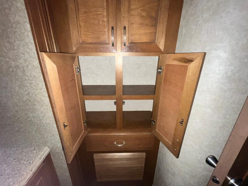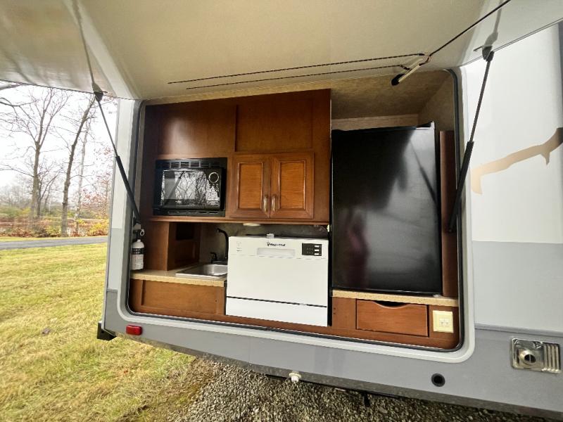 Step inside and see how spacious the interior is with the dual living and kitchen area slides opposite one another fully extended. There is a refrigerator, three burner range, and microwave slide to your immediate left just inside the main entry door. There is also a pantry off to the side for your dry goods and snacks.