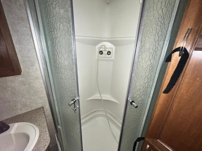 The front of this Roamer RT310BHS model features a side aisle bath with an radius shower, toilet, sink, and a corner linen cabinet.