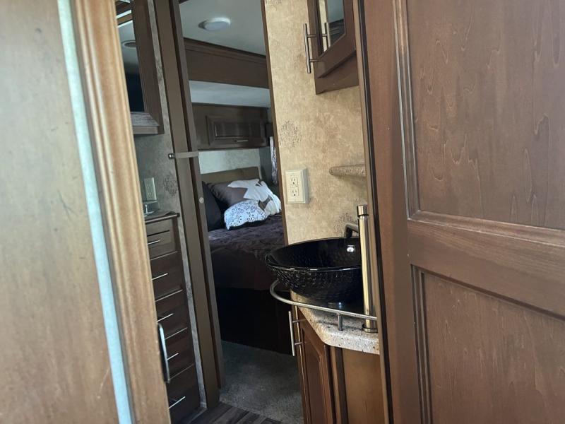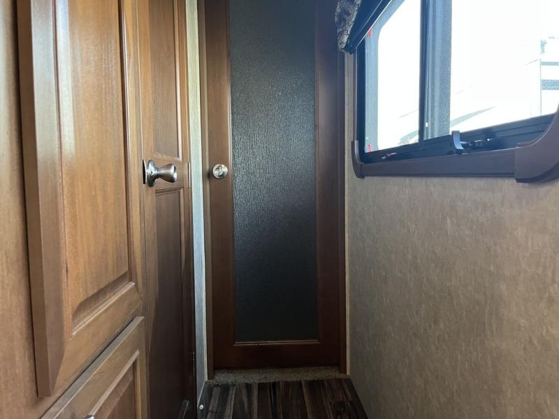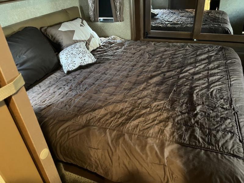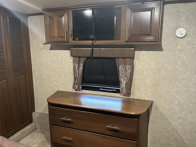 In the bedroom, which can easily be accessed from the hall as well as from inside the bathroom, you will find a king size bed slide out. There is also a chest of drawers opposite the bed and optional TV, plus a full wall wardrobe along the front wall. A corner closet has also been prepped for washer and dryer hook-ups, plus so much more!