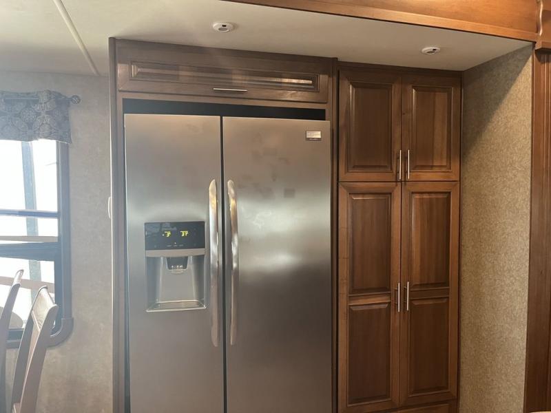 There is a slide out opposite the door that features a sofa with storage above, and two lounge chairs with storage above also. The slide opposite just to the left of the door provides a dining table with four chairs, and a refrigerator, plus pantry. You can choose an optional 12 cu. ft refrigerator, or optional 23 cu. ft residential model if you would like.