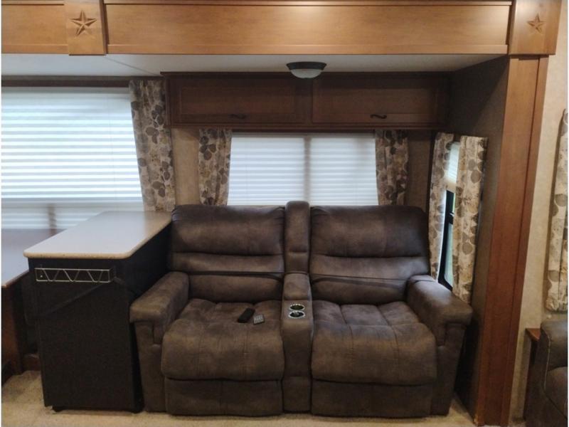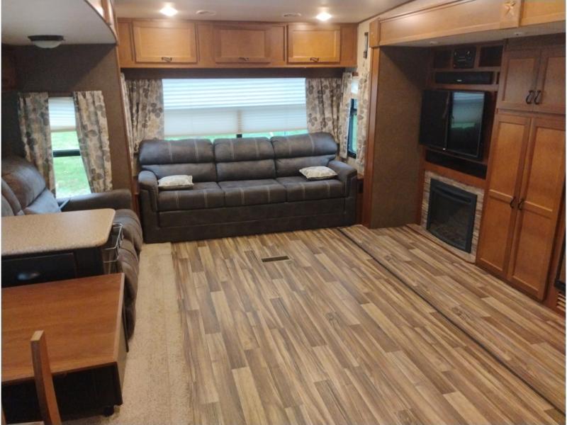 This Open Range Light fifth wheel model 319RLS features triple slides, a rear living layout with a fireplace, a convenient kitchen island on castors, and so much more!
