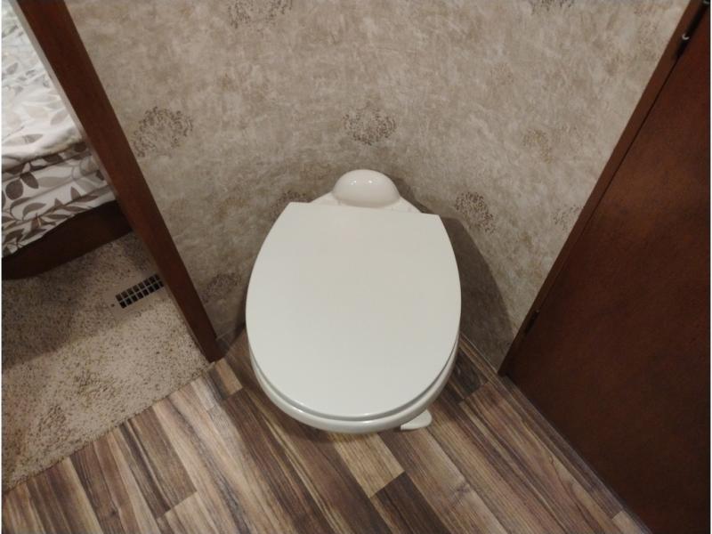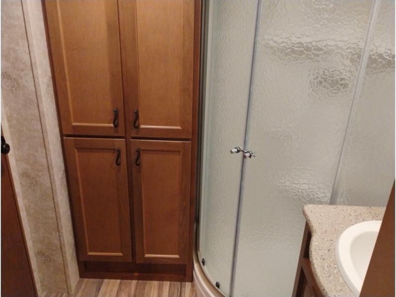 Step up the steps to the right of the entry door and find a complete bath and front bedroom suite. The bath provides a radius shower, sink, toilet, and linen cabinet that has also been prepped for a washer and dryer if you choose to add. The bath features a convenient pocket door that leads directly into the bedroom where you will enjoy a queen size bed including nightstands with open storage below and a cargo net on either side, plus a slide out wardrobe with mirrored doors, and drawers inside, plus so much more.