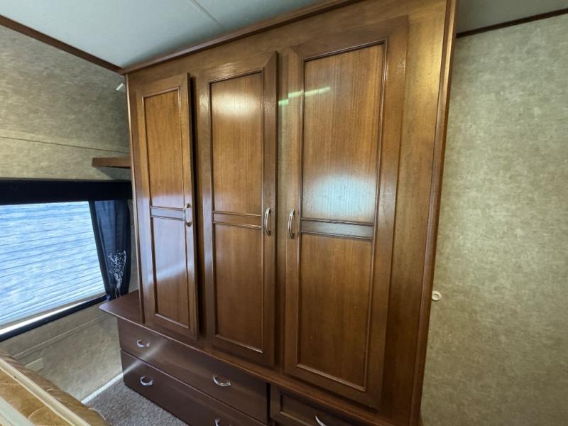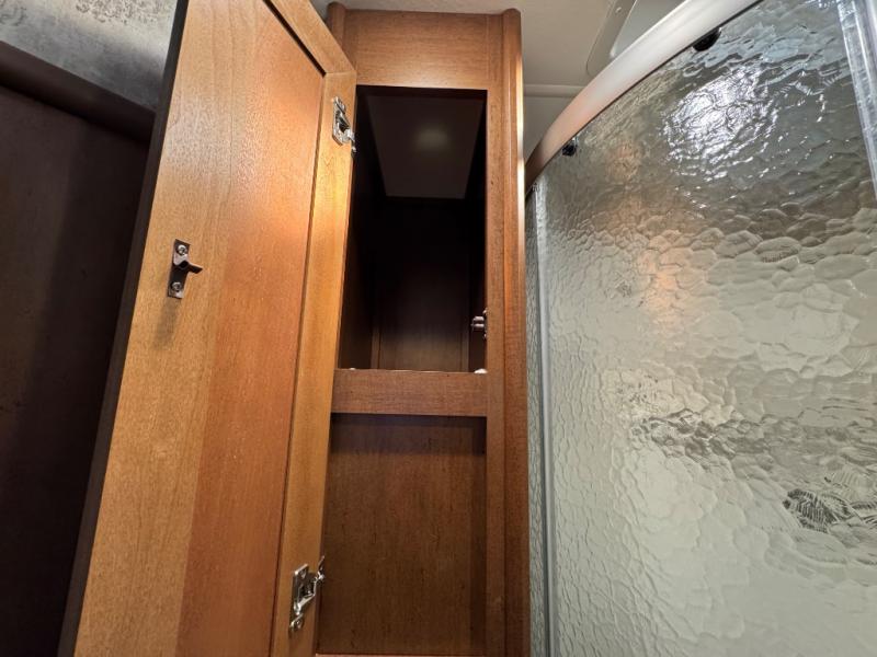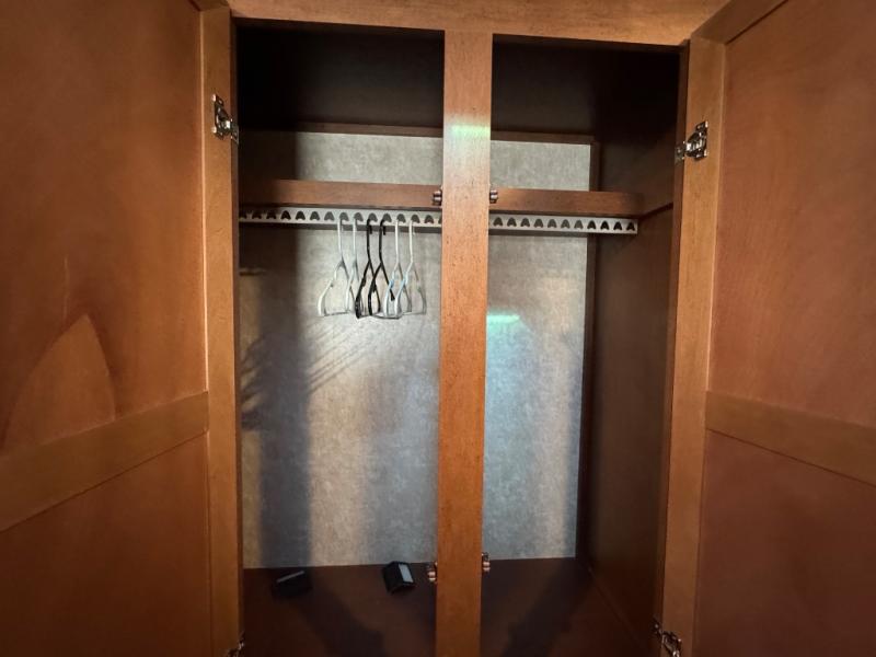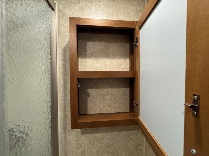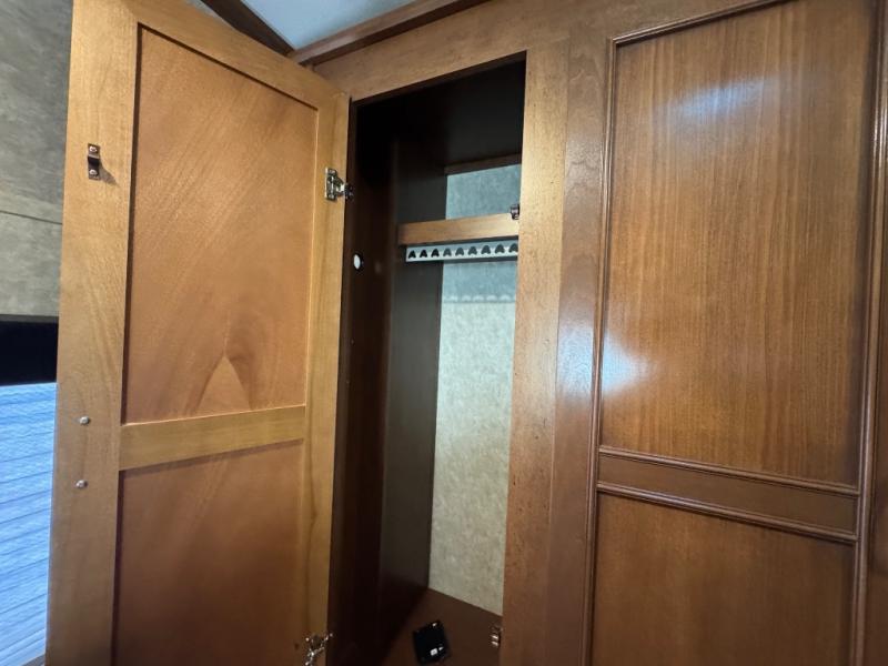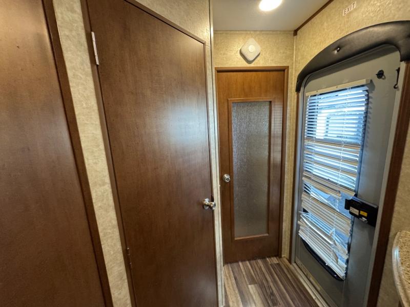 Enter the trailer in the hall just outside the bathroom door. You can also head right and enter the front private bedroom with slide out queen bed. There is a closet/dresser opposite the bed for storage. You can choose to add a TV if you like. And the front wall window is sure to provide a lot of sunshine inside to enjoy.