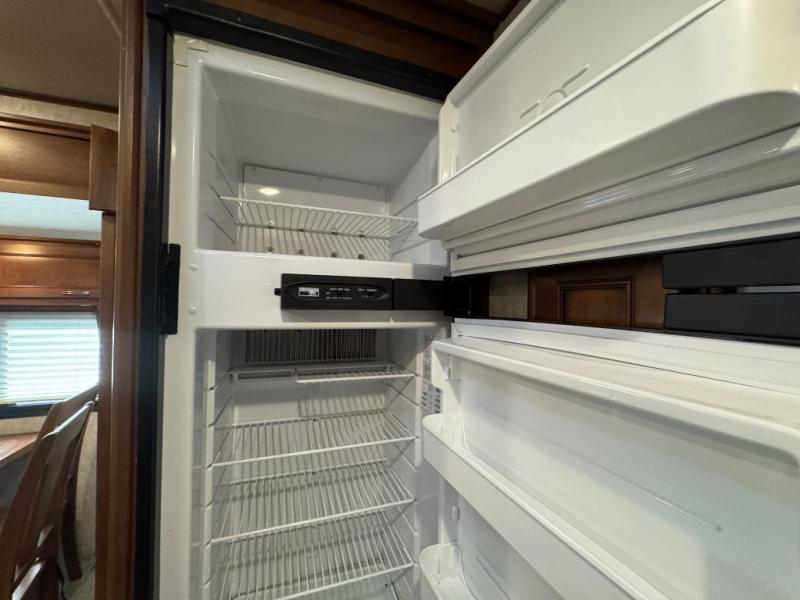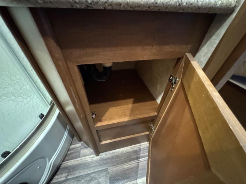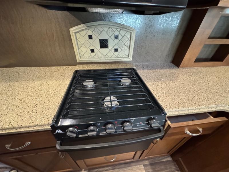 The kitchen features a L-shaped counter with a double kitchen sink, three burner range with microwave oven, and plenty of overhead storage both above and below the counter. The refrigerator is located on the opposite side in the corner between the bath wall and the road side slide.