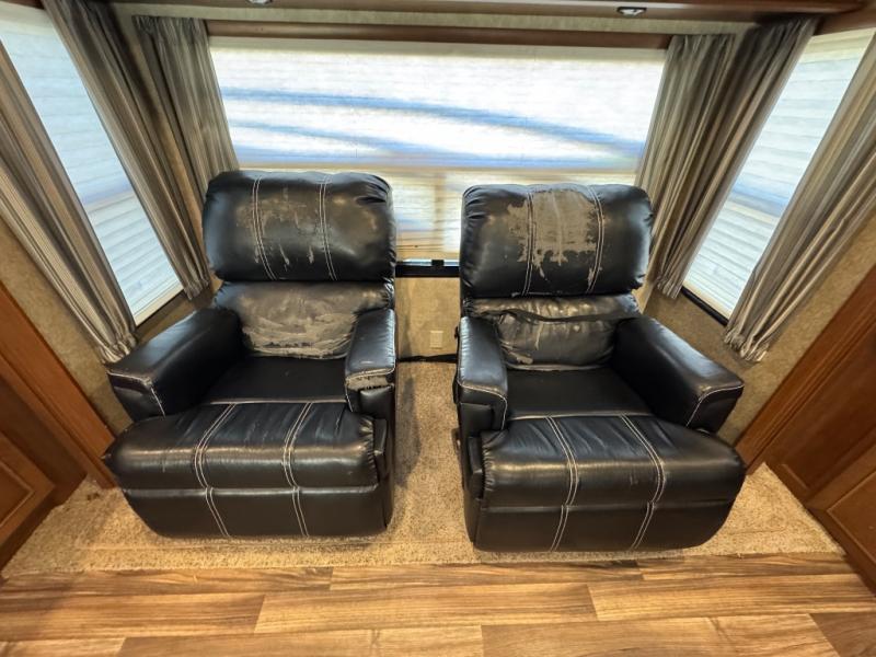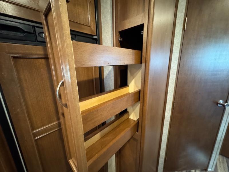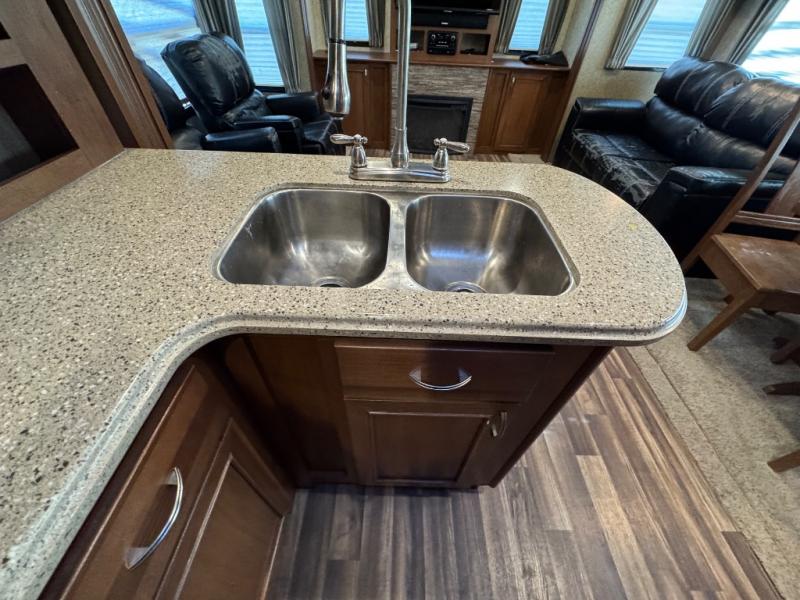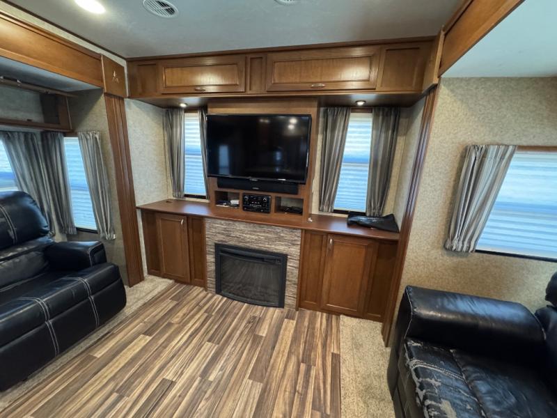 The rear features a full wall entertainment center with TV, and fireplace below. There is storage all along the rear wall. A slide out sofa and table with chairs is beside the refrigerator. A second living area slide is next to the kitchen counter and features two chairs, plus more overhead storage.