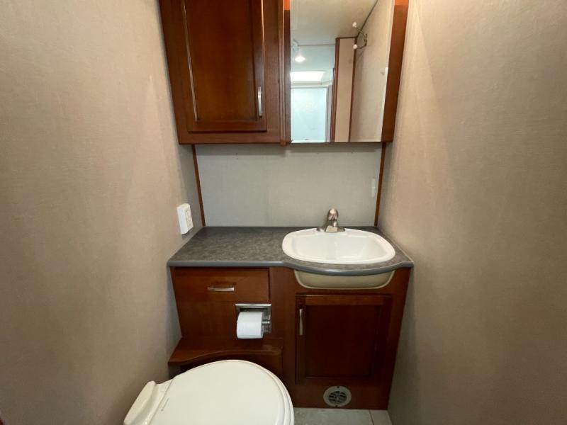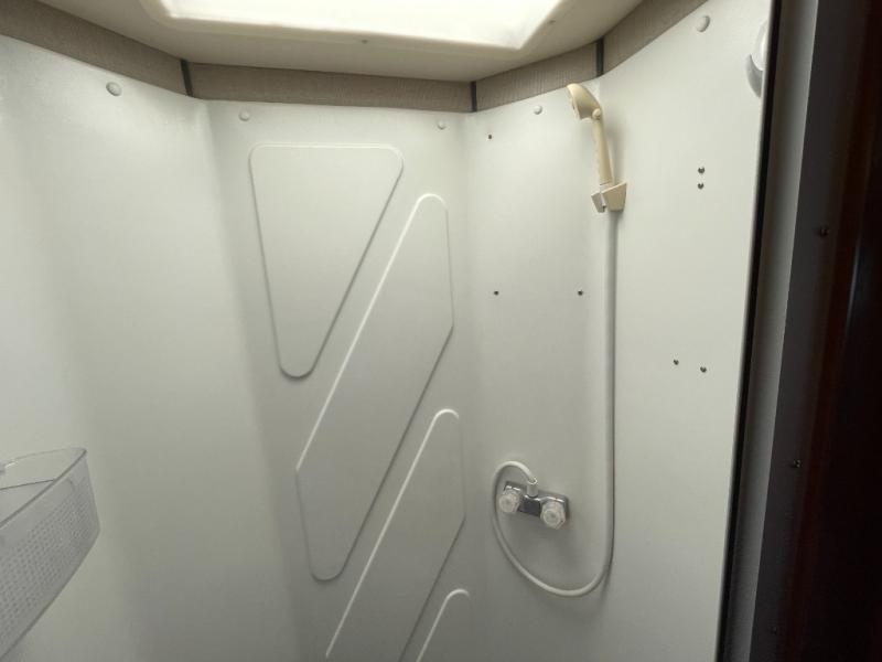 Continue towards the rear of this Admiral XE and find a complete bath split with a shower on the right side, and private toilet area and vanity with sink on the left.