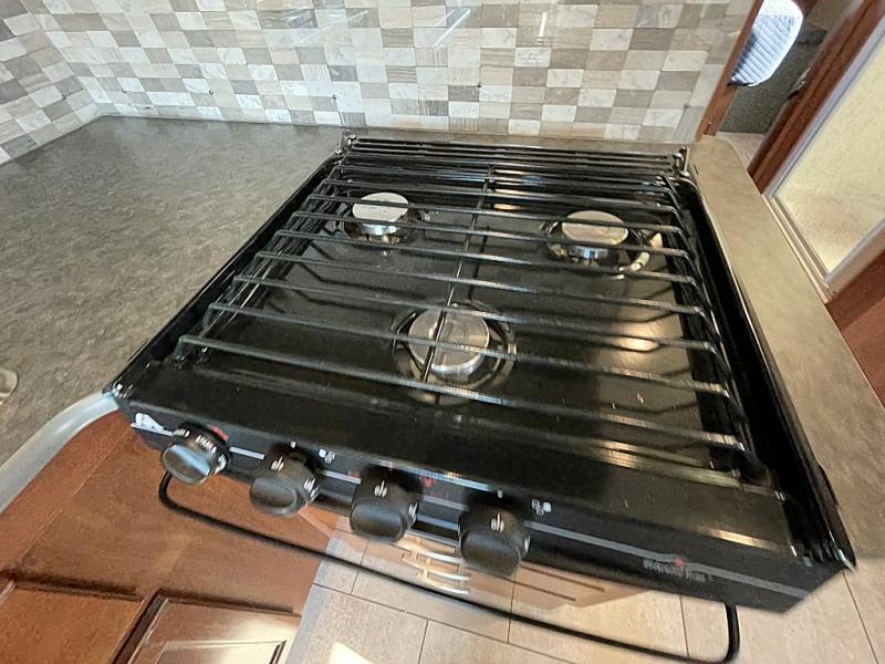 The rest of the kitchen can be found to the left of the main entry door where you will find a double sink, and three burner range with overhead microwave oven. The overhead cabinets make it easy to stow away all of your dishes and kitchen items that make meal prep simple.