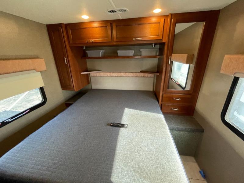 The very rear of the coach features a spacious retreat where you can rest easy on the queen bed provided. There are wardrobes and nightstands on either side, and a 19" LED swing arm TV, plus so much more!