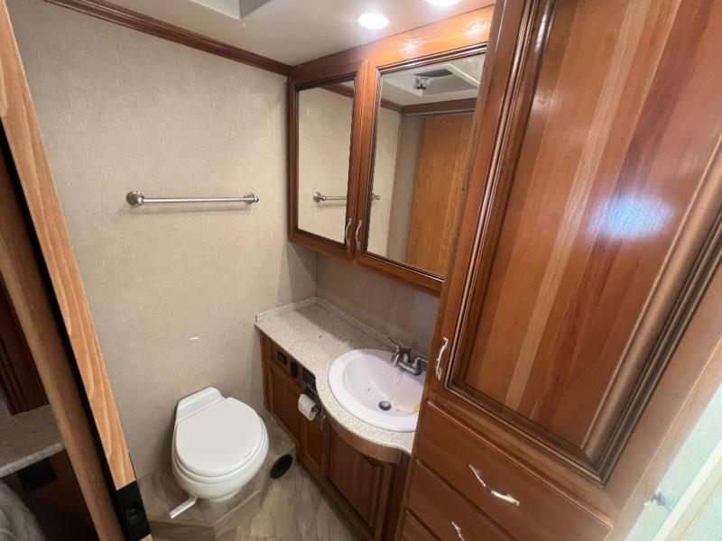 Opposite the L-sofa there is a 40" LED TV along the angled outer bath wall for easily viewing while seated along the road side. There is also a half bath mid coach which includes a toilet and vanity with sink, plus overhead storage.