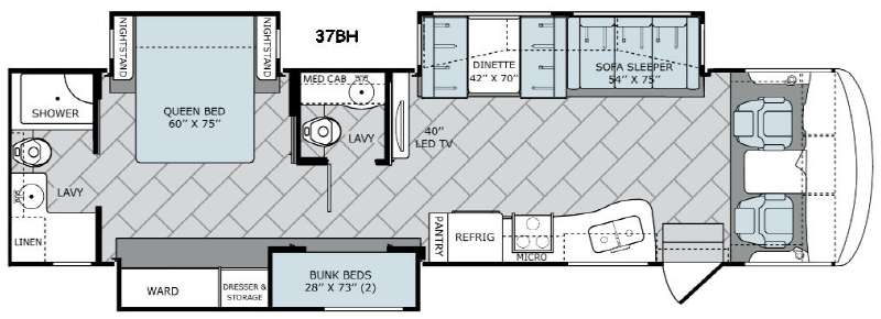 A 40" LED TV is along the interior wall mid coach for your enjoyment, and you can also add a fireplace beneath if you wish.