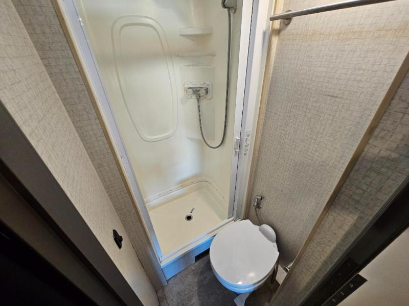 The rear double bed offers storage along the head of the bed, and also the curb side wall. There is a spot to add an optional flat screen 24" HDTV to the bedroom if you choose.