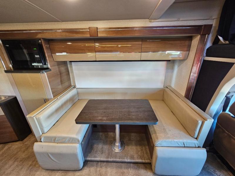 Straight ahead as you enter there is a slide out wardrobe and u-shaped dinette with foot rests on either end. Travel safely with three sets of seat belts attached to the dinette seating for rear travelers. There is also a 42" x 82" dining table that is perfect for enjoying a meal at.