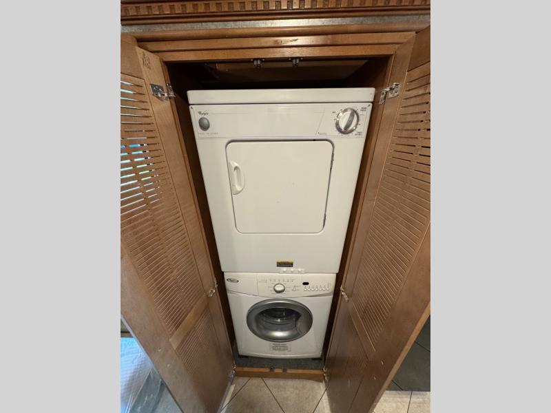 Heading further back you will come to the kitchen and bath area. The kitchen begins at the head of the driver's side slide out with an angled double sink, a three burner range, a residential refrigerator, and storage cabinet that is also the location of the washer and dryer if you wish to add that convenience. Here you will have no problem creating meals and snacks while on the move.