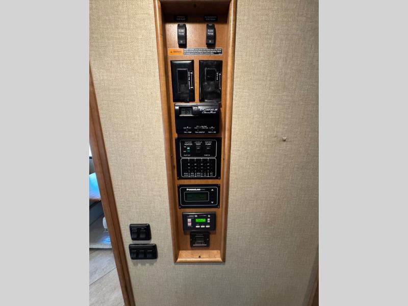 The rear master bedroom features a queen bed slide including nightstands and overhead storage. The chest of drawers opposite is part of the large slide on the road side that also features the kitchen appliances. Here you will enjoy storage drawers for your things, plus there is a HDTV location as well. Along the rear wall find even more storage with a wardrobe and cabinet. You can choose a king size bed if you wish for a bit more sleeping space, plus so much more!