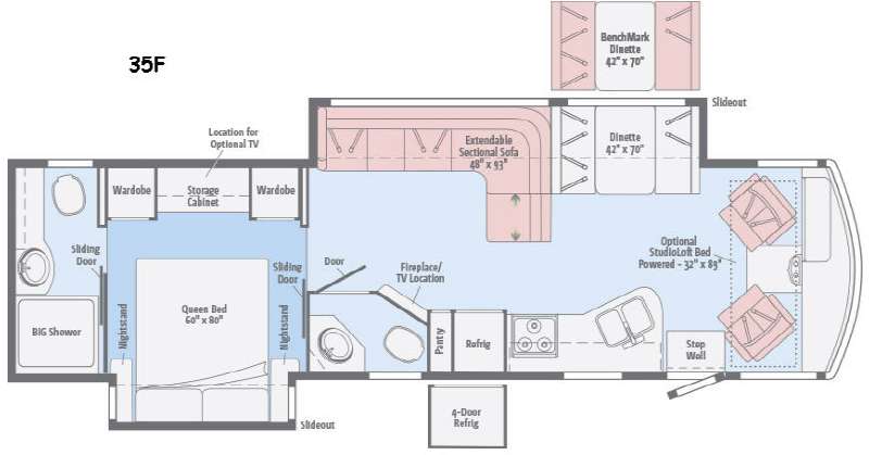 As you enter notice the large slide out opposite the door that features a dinette and extendable sectional sofa. You can also choose the BenchMark Dinette instead. All feature seat belts so you can safely travel in the back of the coach.