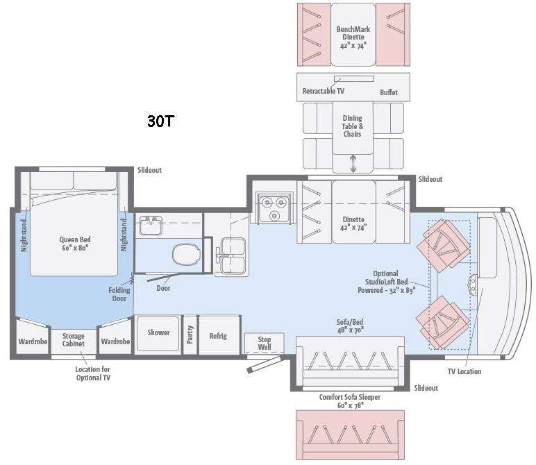 This class A coach features a wide open living area with dual opposing slides just behind the front cab seats that can swivel toward the rear for added seating. The slide to the right of the side entry door features a 48" x 70" sofa bed, or you can choose the 60" x 78" Comfort Sofa Sleeper. On the opposite side there is a slide out three burner range, and 42" x 74" booth dinette with seat belts. You can also select the optional dining table and chairs with buffet featuring a 40" retractable TV, or a BenchMark Dinette instead. A refrigerator is located to the left of the entry door along with a pantry for storage, opposite the dinette slide is a double sink, plus overhead cabinets for all of your dishes and things.