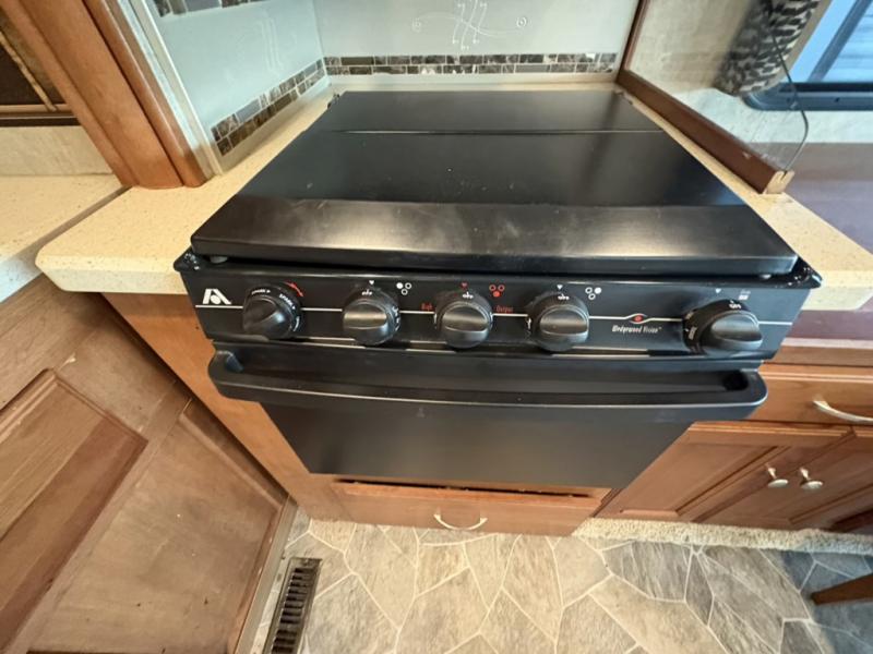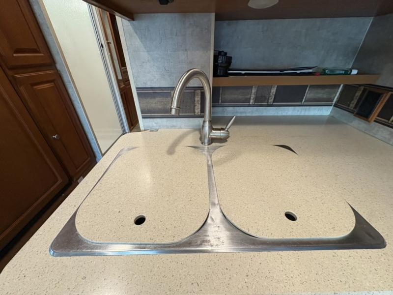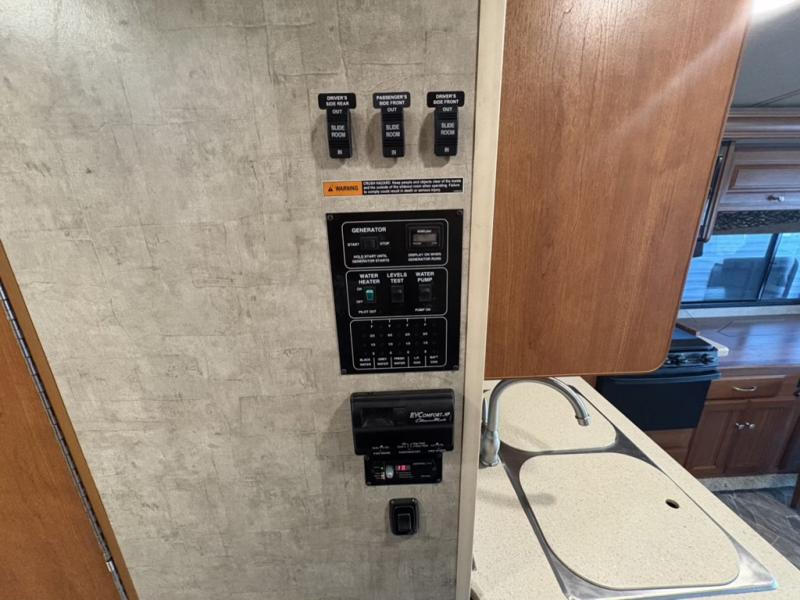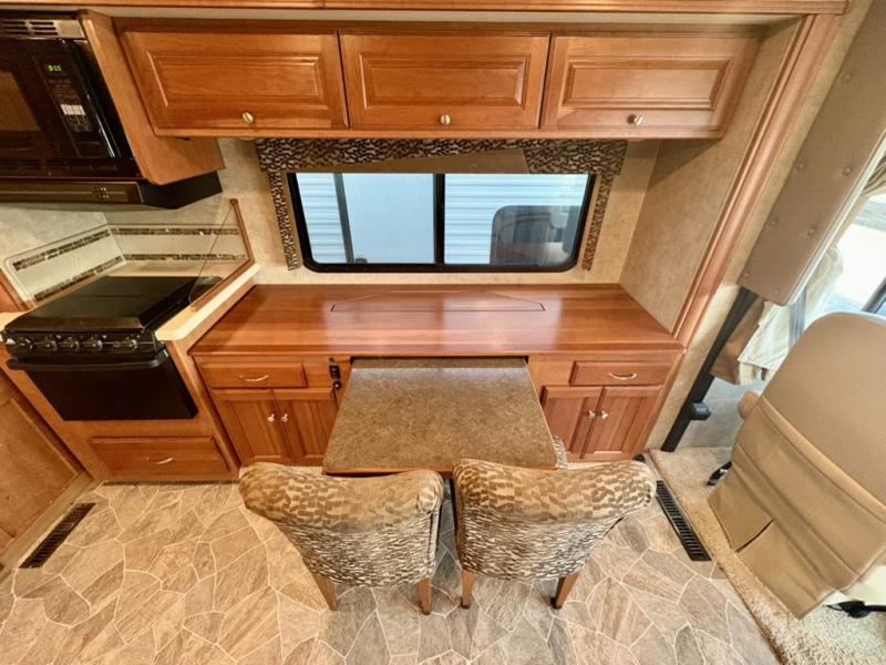 This class A coach features a wide open living area with dual opposing slides just behind the front cab seats that can swivel toward the rear for added seating. The slide to the right of the side entry door features a 48" x 70" sofa bed, or you can choose the 60" x 78" Comfort Sofa Sleeper. On the opposite side there is a slide out three burner range, and 42" x 74" booth dinette with seat belts. You can also select the optional dining table and chairs with buffet featuring a 40" retractable TV, or a BenchMark Dinette instead. A refrigerator is located to the left of the entry door along with a pantry for storage, opposite the dinette slide is a double sink, plus overhead cabinets for all of your dishes and things.