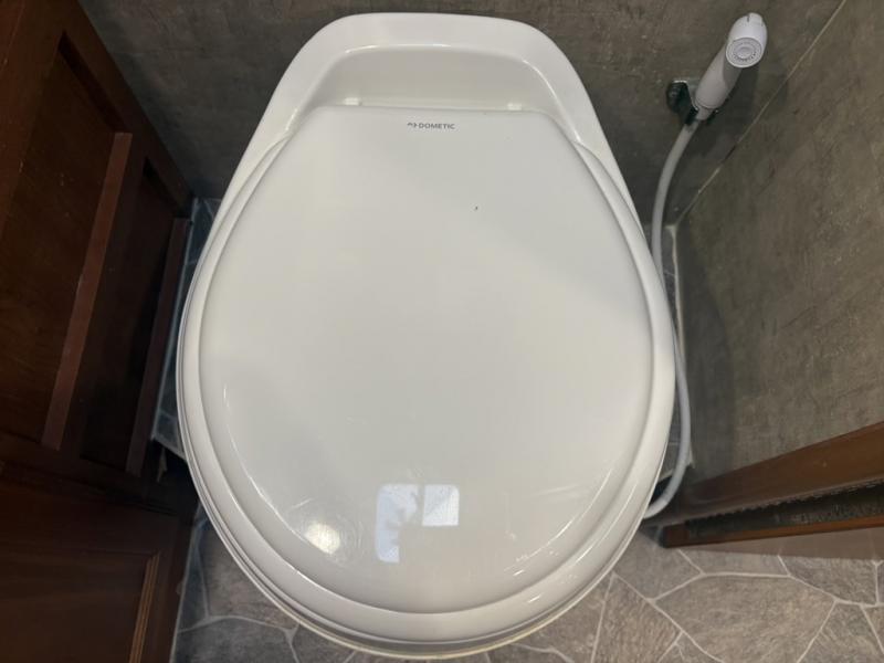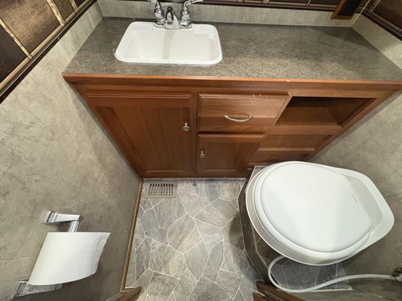 Head toward the rear bedroom and pass by a shower on the left and private toilet area with vanity and sink including overhead storage on your right.