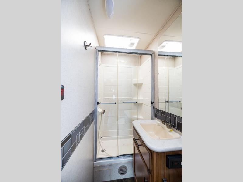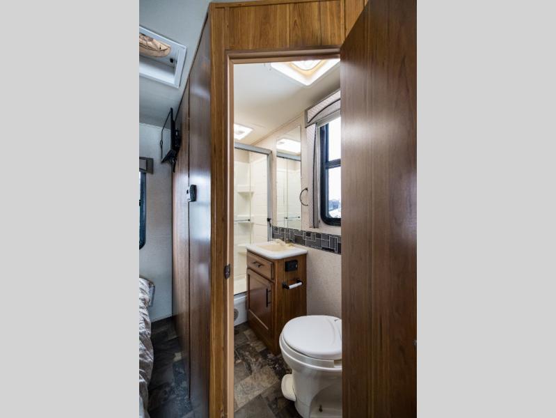 Also in the rear of the motor home is the bathroom. The bathroom has a toilet, sink, and shower. Outside of the bathroom there is a linen cabinet where you can easily store towels or toiletries.