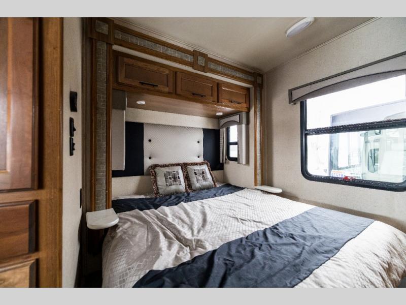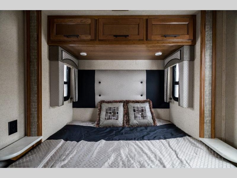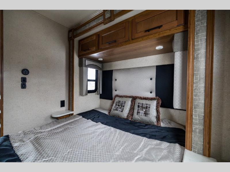 The bedroom is located in the rear of the motor home and you will find a slide with a queen bed, nightstands on either side of the bed, and an overhead cabinet above the bed. On the wall across from the bed there is an optional TV. The large wardrobe provides additional storage space for your clothes.