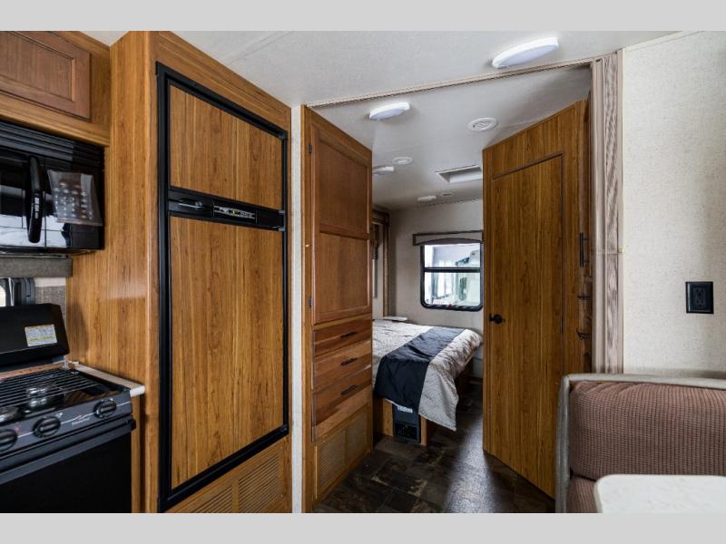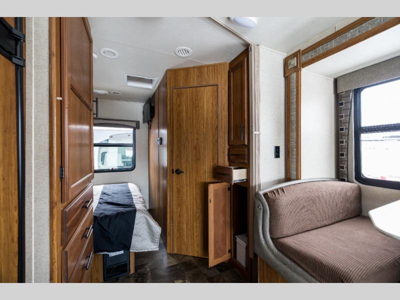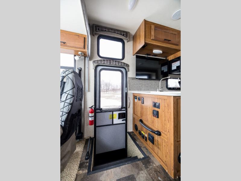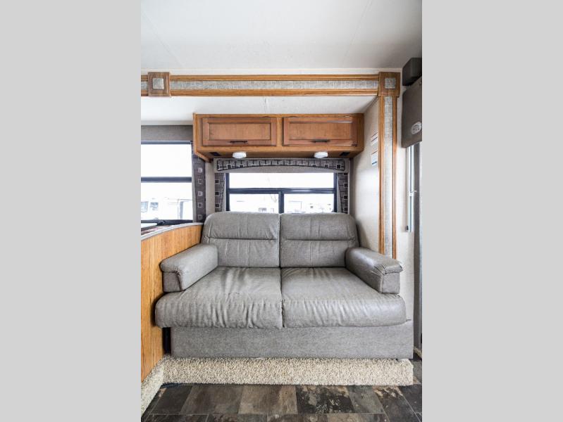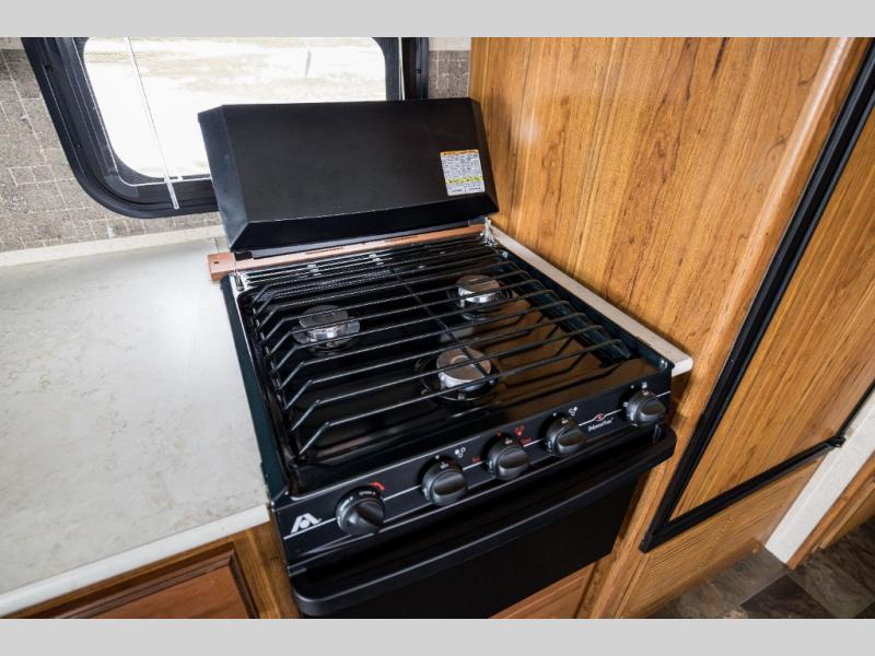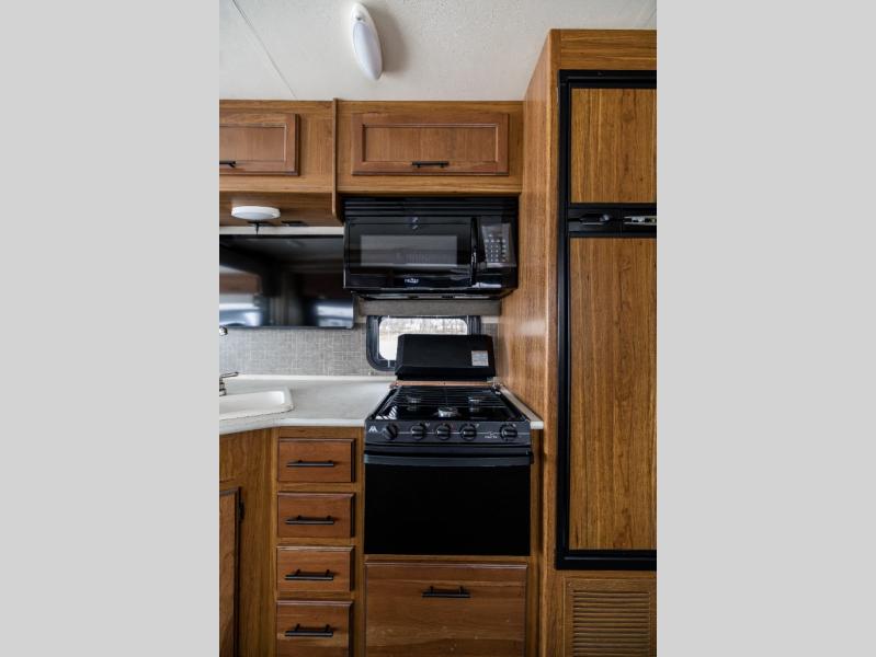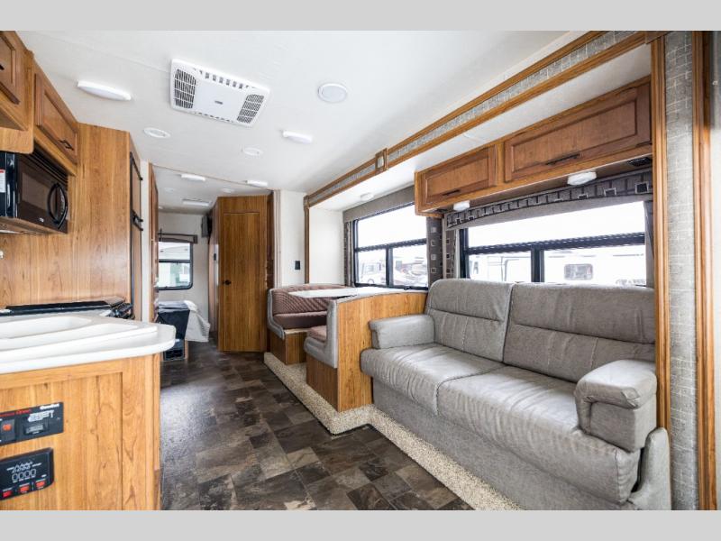 Step inside the motor home and see how spacious and open the living and kitchen areas are with the slide that is located behind the driver's seat. The slide has a sofa with an overhead cabinet and a dinette. Above the cab area you can choose to an optional drop down bunk. Behind the passengers seat, the kitchen area has an angled double kitchen sink, overhead 39" TV, microwave, three burner range, and refrigerator.