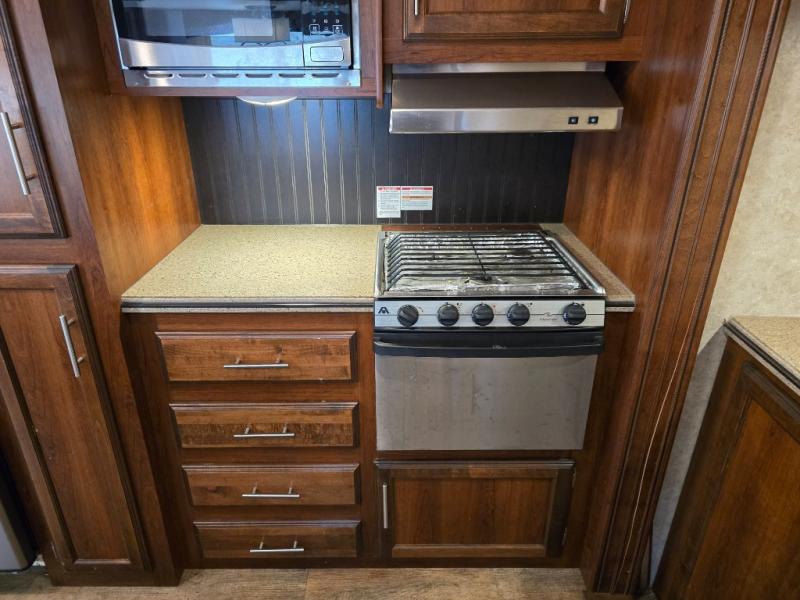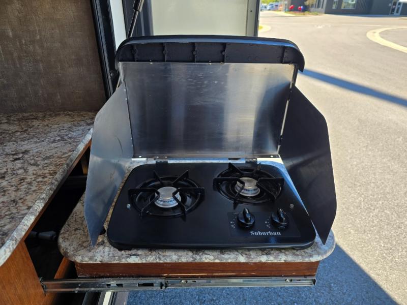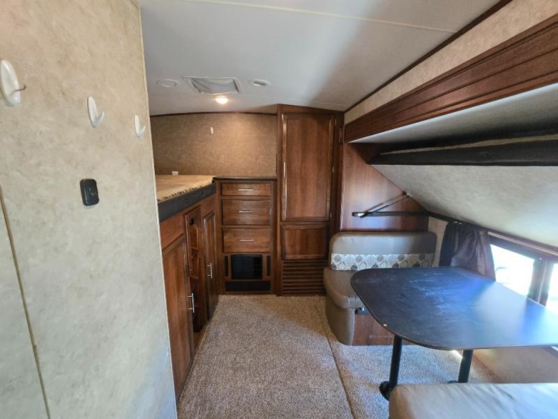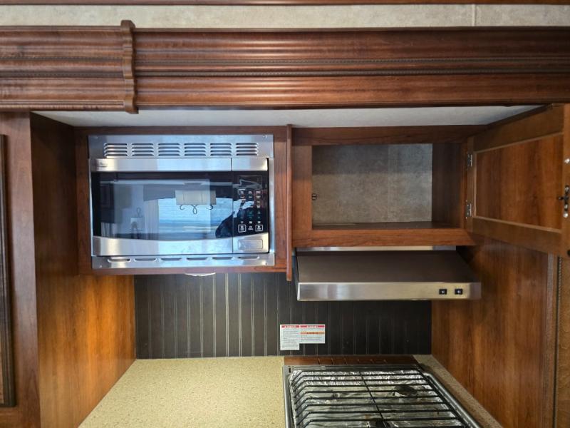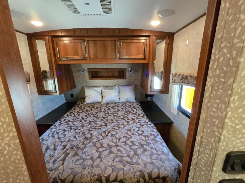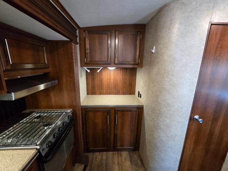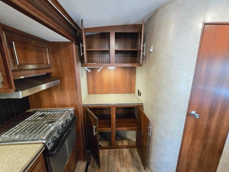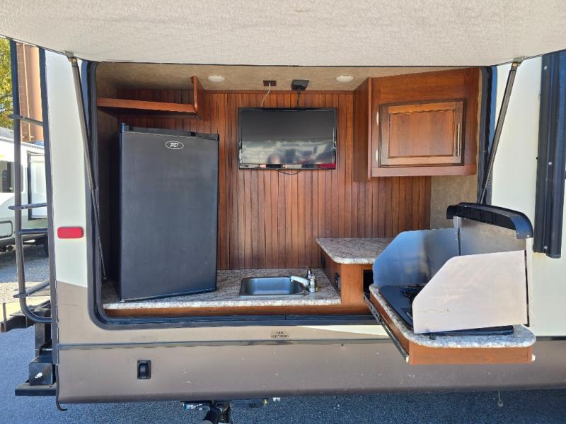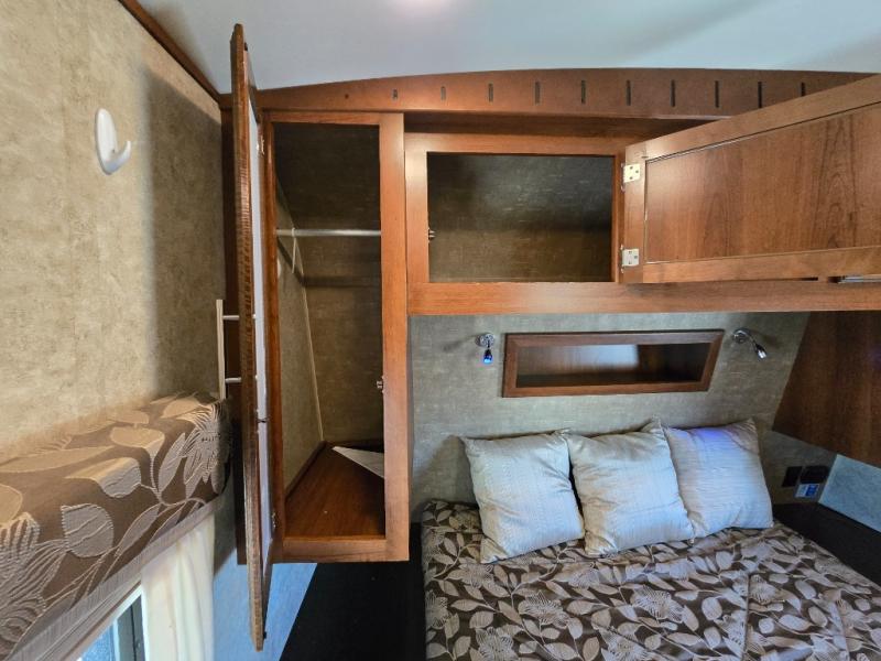 There are plenty of overhead cabinets throughout the travel trailer as well as outside storage. You can even enjoy the outside kitchen which has a refrigerator, sink, and two burner cooktop.