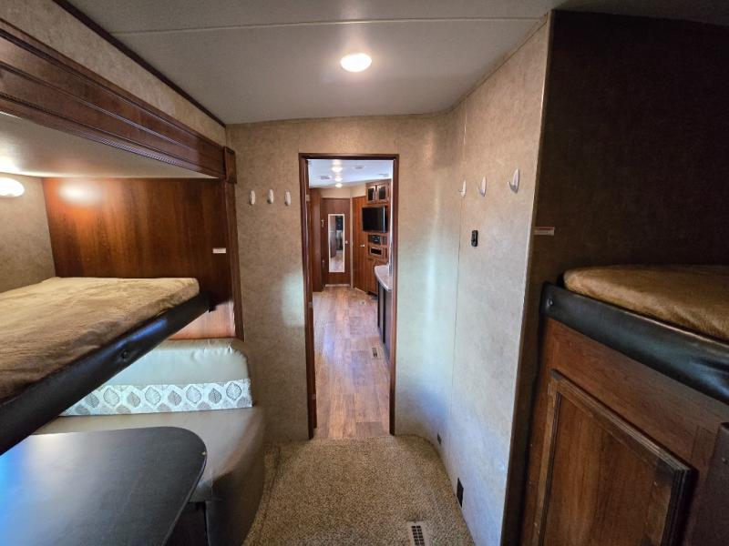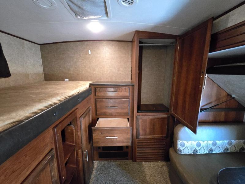 In the rear of the trailer, you will find the bunkhouse. There is a slide featuring game chairs below an upper bunk, a wardrobe, cabinet/dresser, and an additional wardrobe with a bunk above.