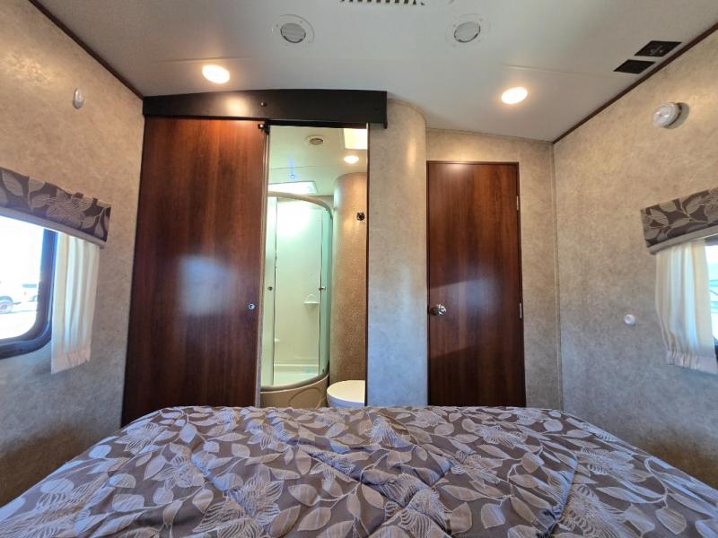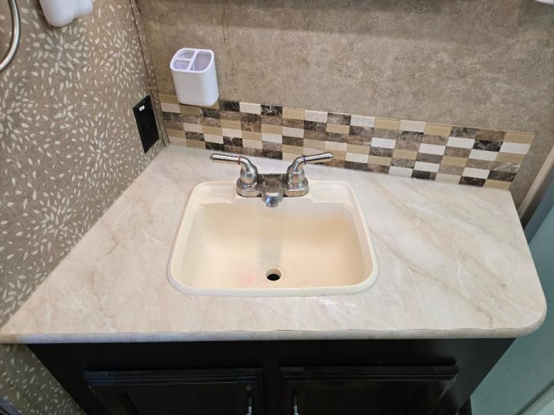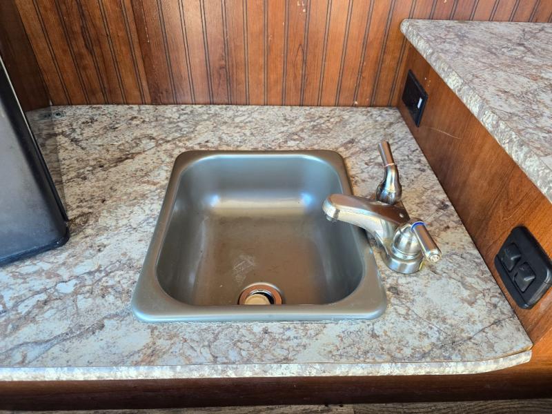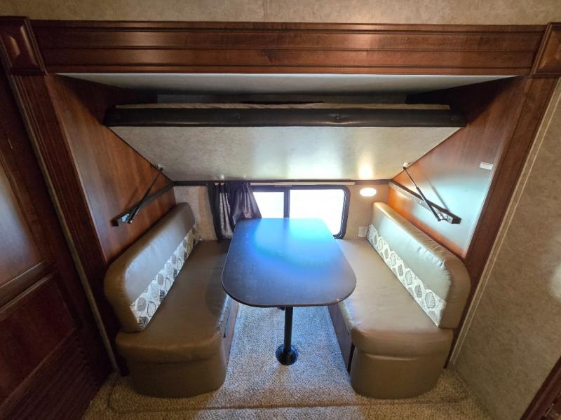 As you step inside to the left is a slide with a refrigerator, pantry, microwave, and three burner range. You will also find a hutch with overhead cabinets along one interior wall. The kitchen island has a double sink and extra countertop space. There is another slide in the kitchen/living area with a booth dinette and a hide-a-bed sofa with overhead cabinets. From the sofa and dinette you can easily view and enjoy the angled entertainment center.