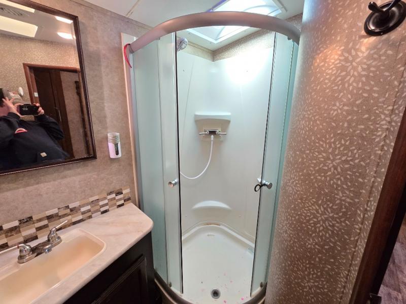 The side aisle bath offers an angled toilet, corner shower, sink, and medicine cabinet. There is linen storage outside the bathroom door. You are able to access the bathroom through the aisle door or the sliding bedroom door.