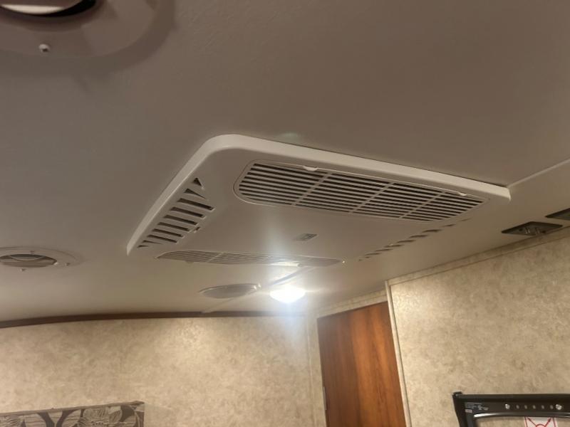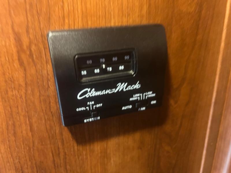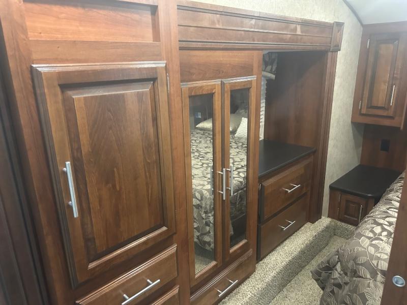 In the front bedroom you will find a slide with a linen cabinet, wardrobe, and dresser. There is also a queen bed, two wardrobes, overhead cabinet, plus an optional TV.