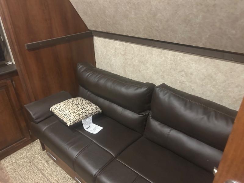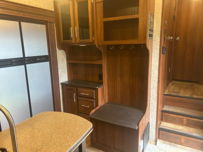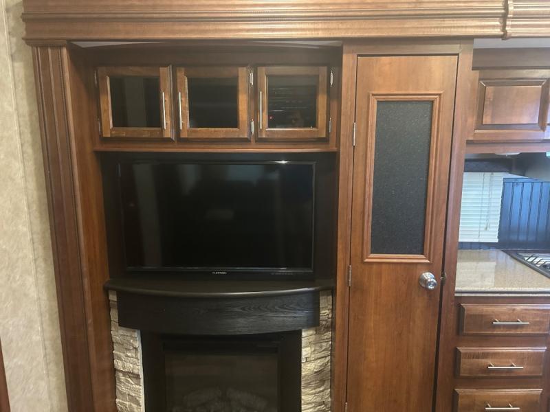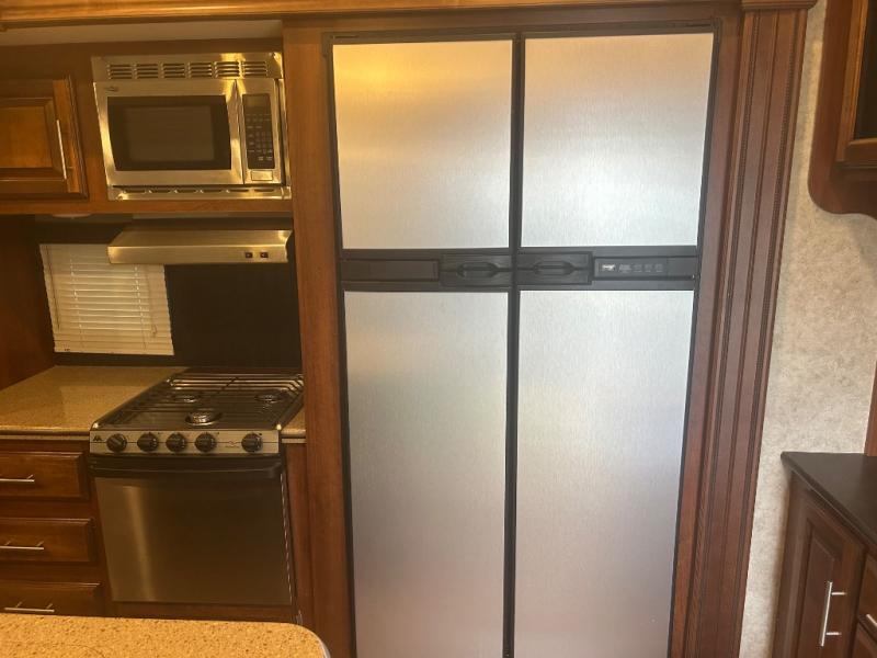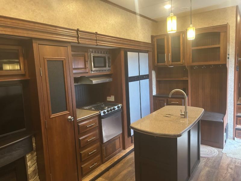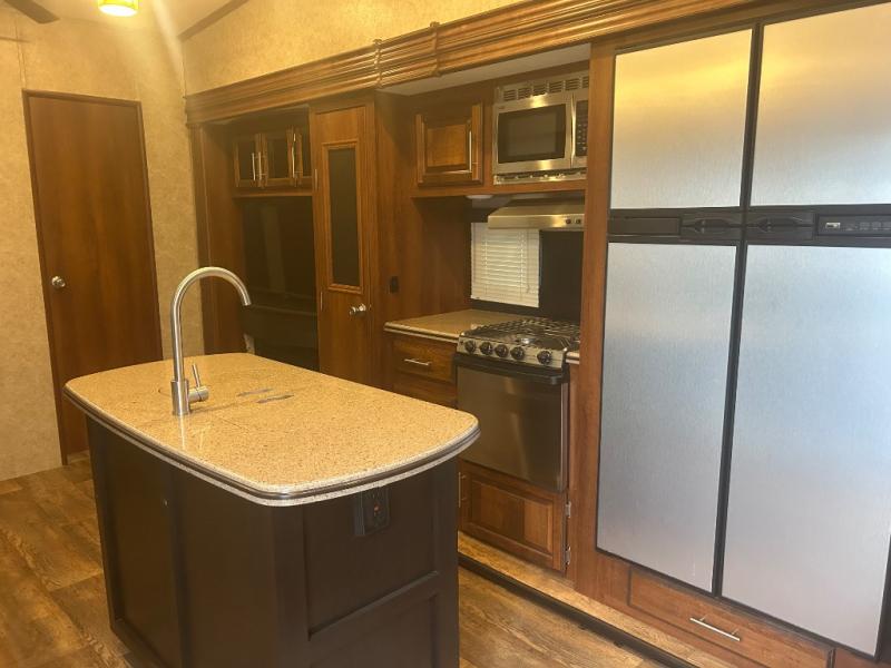 On the road side of the fifth wheel you will find a slide that includes an entertainment center with fireplace, pantry, microwave, three burner range, another pantry, and a refrigerator. You may even choose a large 12 cu. ft. refrigerator. You will find the double kitchen sink located in the kitchen island. There is also a bit of extra counter space on the island which makes food prep a bit easier.