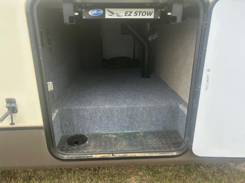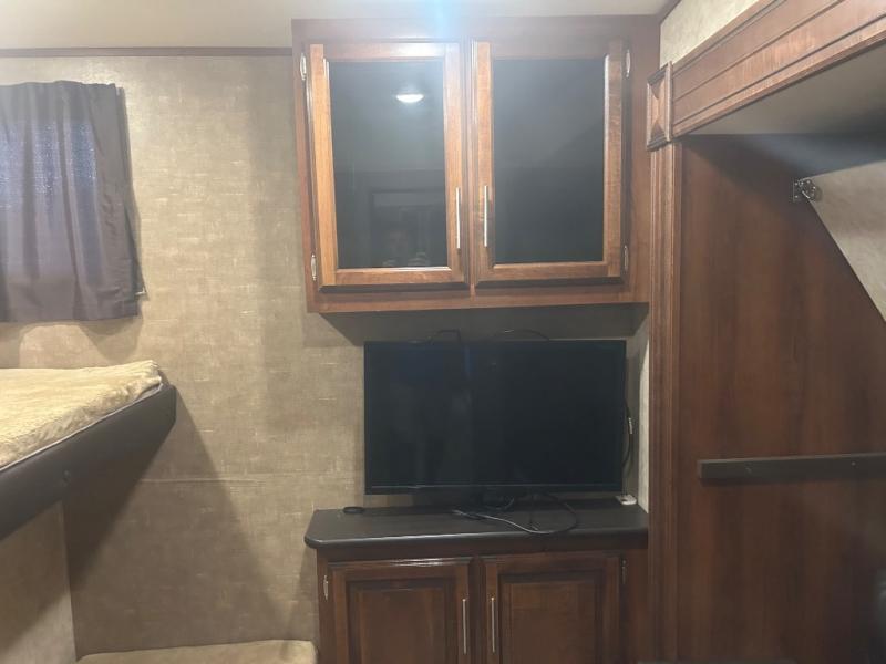 Your kids are sure to love the rear bunkhouse. There is a slide with a flip down sofa sleeper with storage drawers, and a folding bunk above the sofa. Across from the sofa there is another set of bunk beds. Along the rear wall of the room you can watch an optional TV. You can store your clothes in the wardrobe closet beside the door.