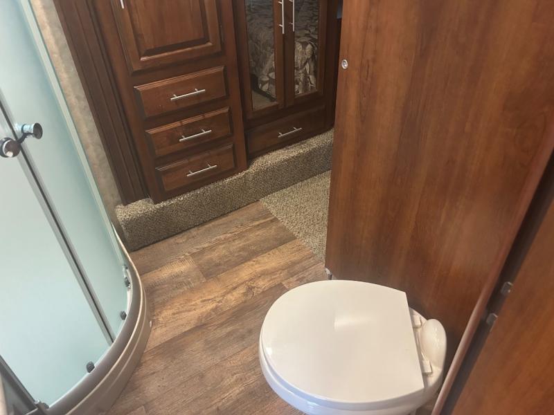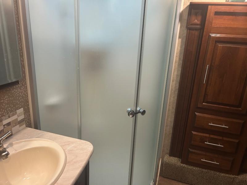 Stepping up the stairs towards the front and to the left is the bathroom featuring a sink, medicine cabinet, corner shower, toilet, and linen storage that is included the bedroom slide out.