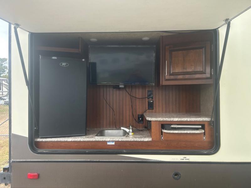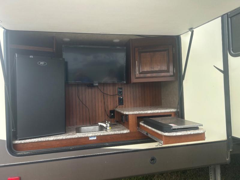 Outside you can grab a quick snack at the exterior kitchen which includes shelves, a sink, two burner cook-top, and an optional TV, plus much much more inside and out!