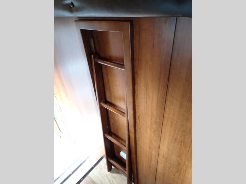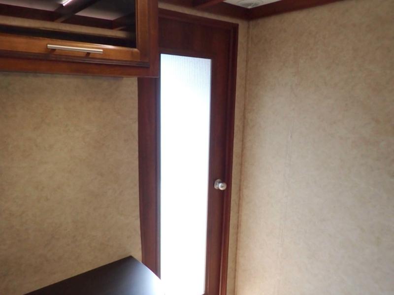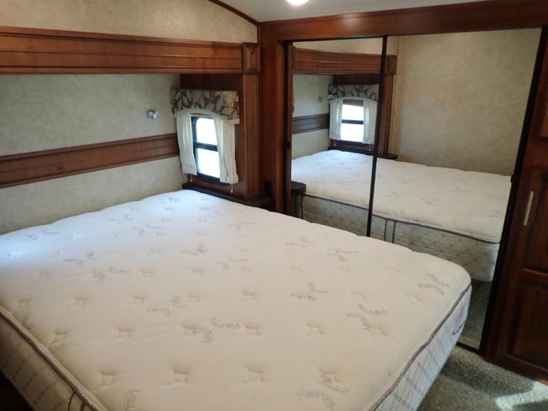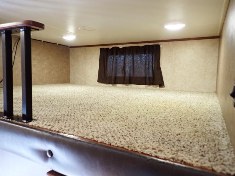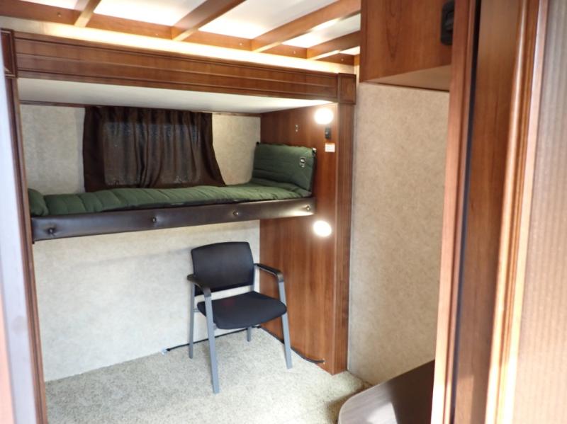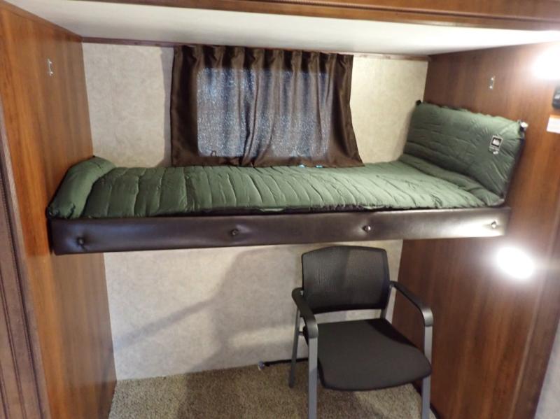As you step inside this fifth wheel, the second bedroom is directly in front of you. Inside the bedroom you will find a slide including a 48" x 60" top bunk, a 48" x 72" lower bunk, a corner wardrobe with optional TV, and overhead cabinets on both sides of the room.