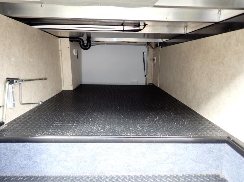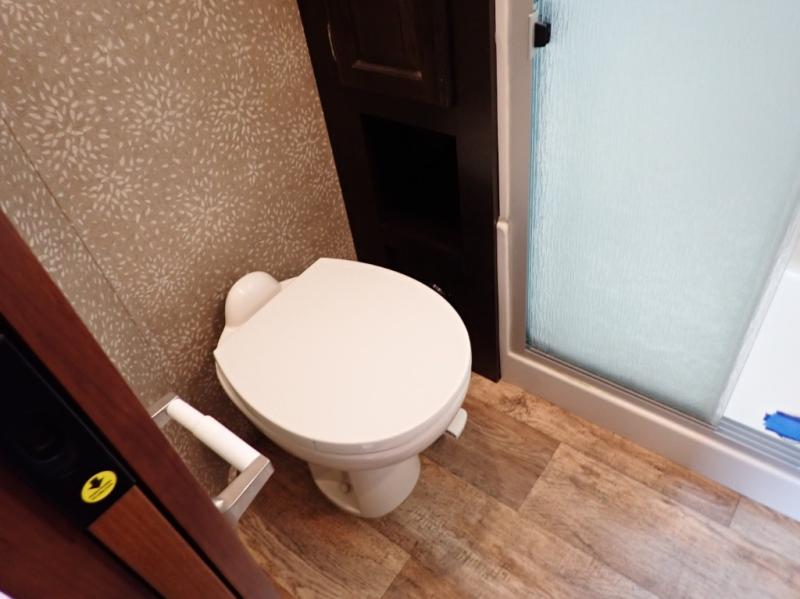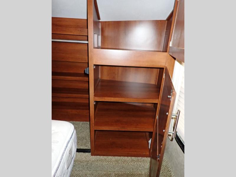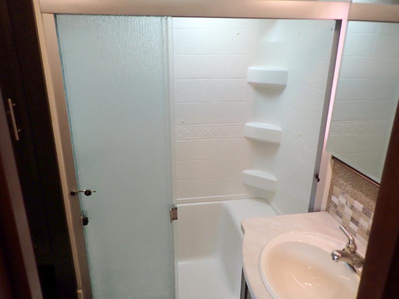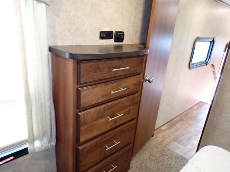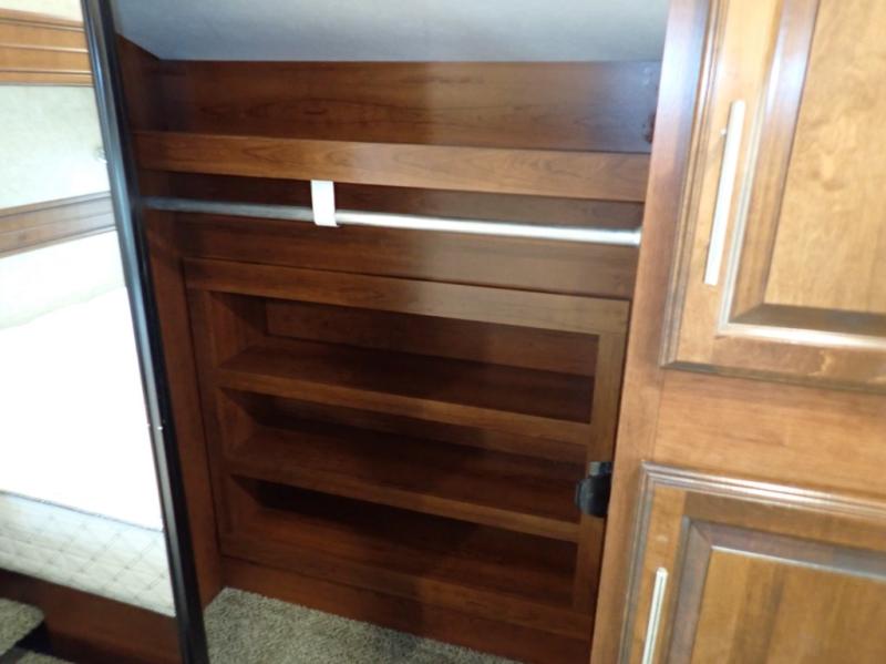 In the master bedroom there is a road side slide with a queen bed and nightstands. You will find storage under the bed which is great for storing your blankets or luggage. Across from the bed there is a chest with optional TV, and along the front wall of the room you will find a walk-in closet with shelves. In the front corner of the room is wardrobe that is prepped for a washer/dryer for your convenience.