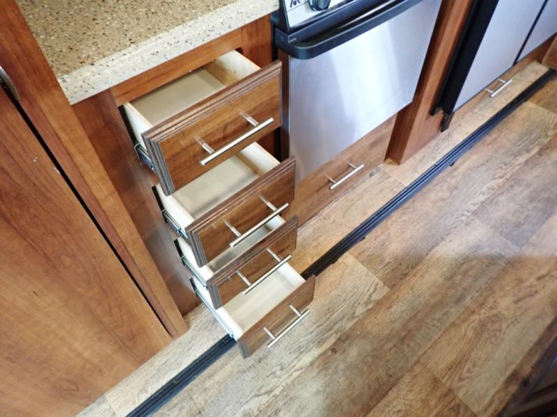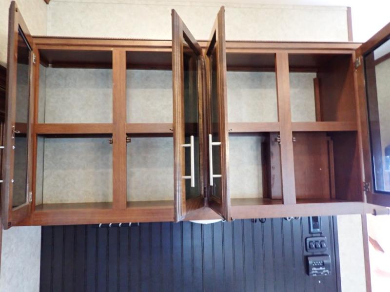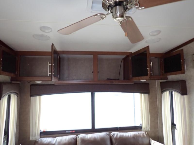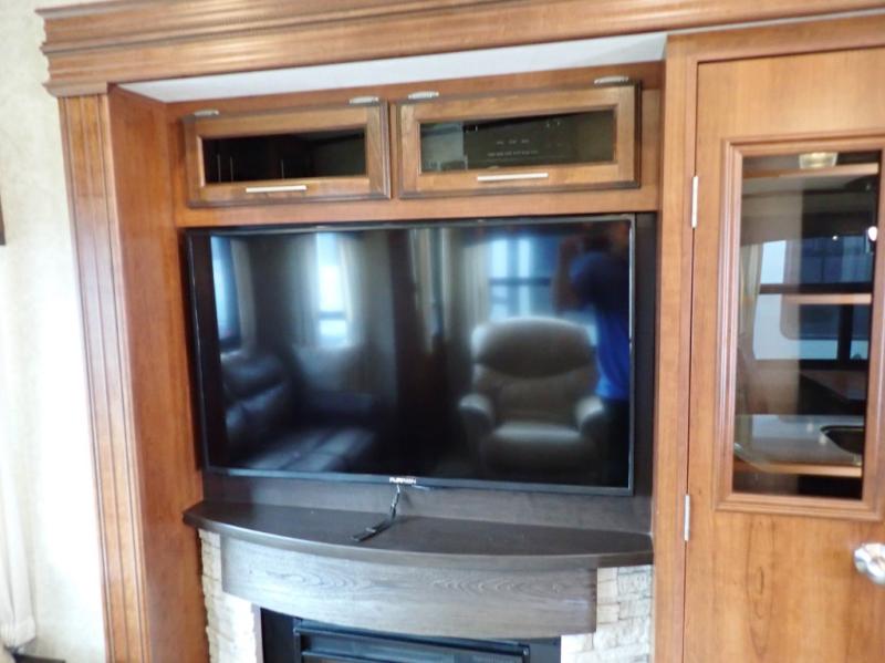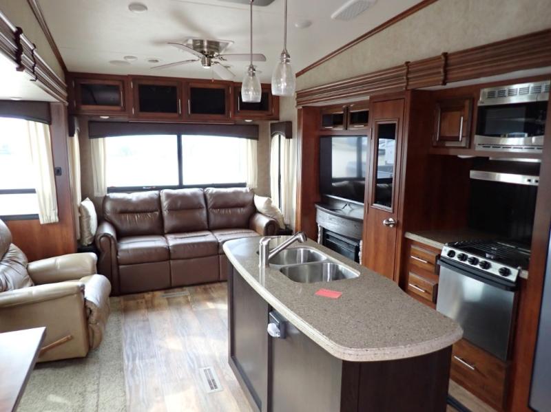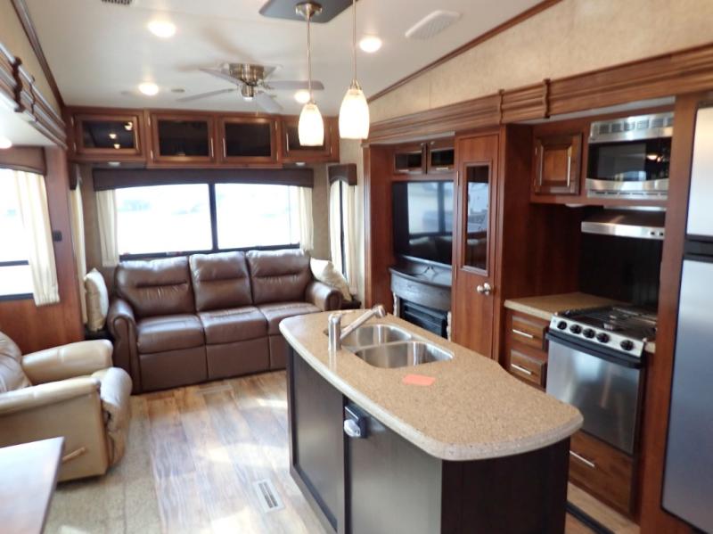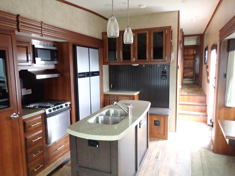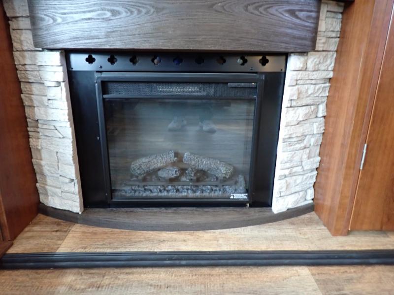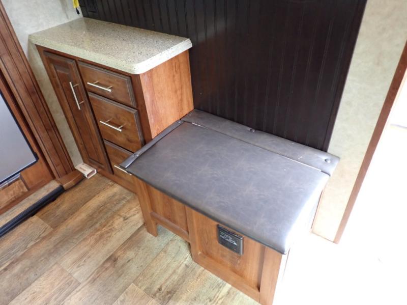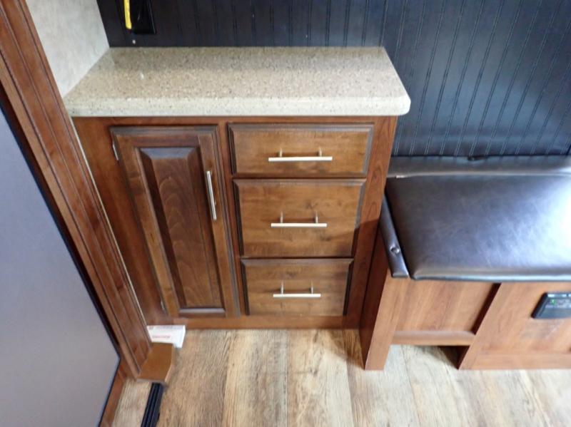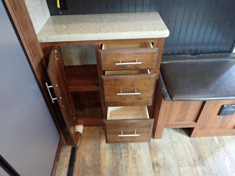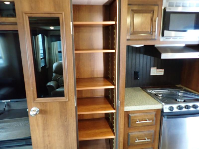 Head back towards the kitchen and living area and you will notice how open and spacious it feels with two slides. One slide has a booth dinette and a theater sofa. On the opposite slide there is a refrigerator, pantry, three burner range, microwave, second pantry, and an entertainment center with fireplace. Adjacent to the slide there is a hutch, bench, and overhead cabinets. In the middle of the kitchen you will find extra counter space with the island as well as the double kitchen sink and ceiling fan.