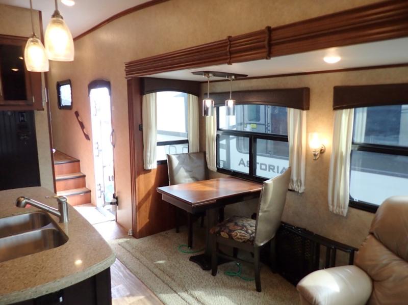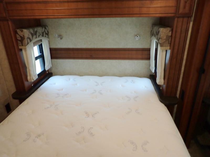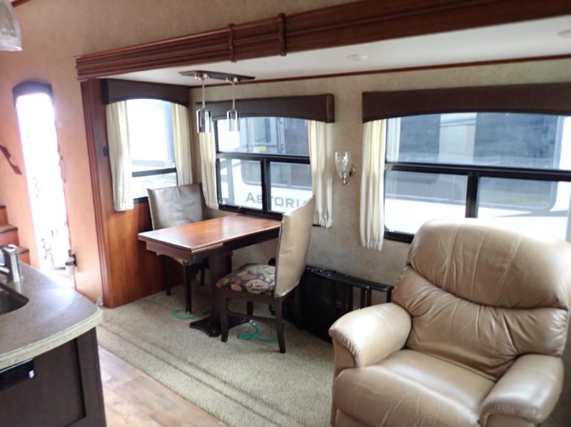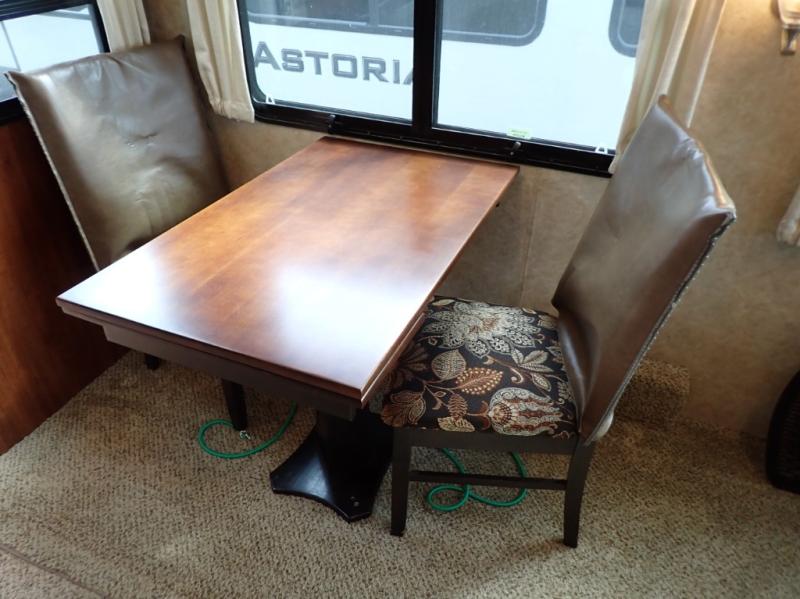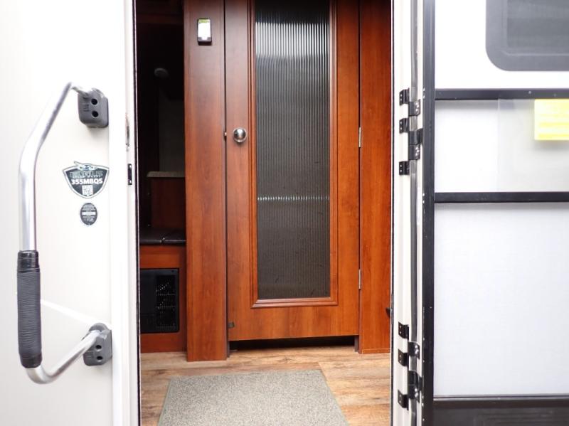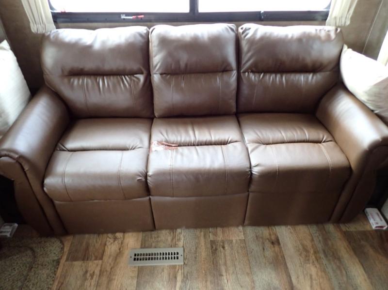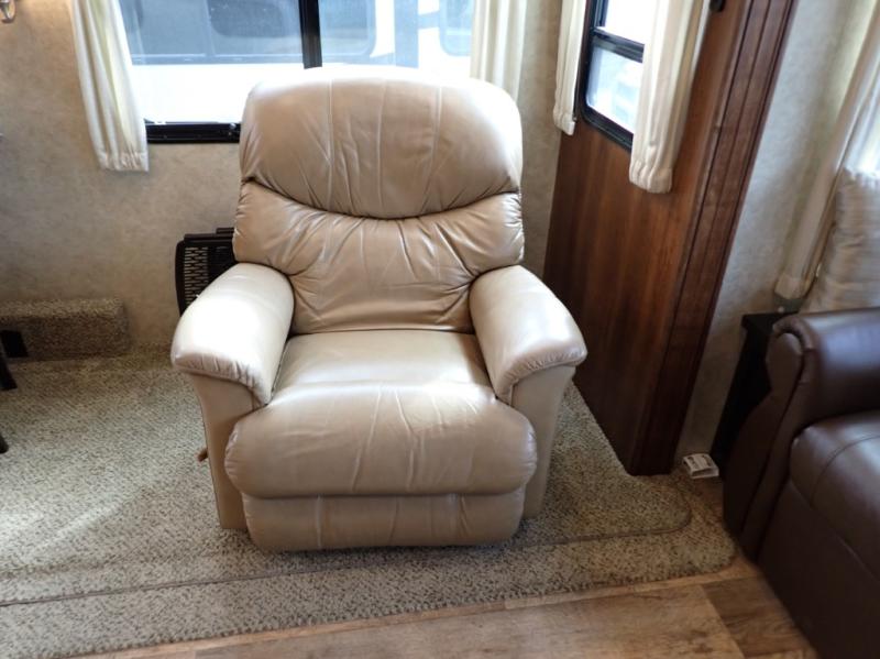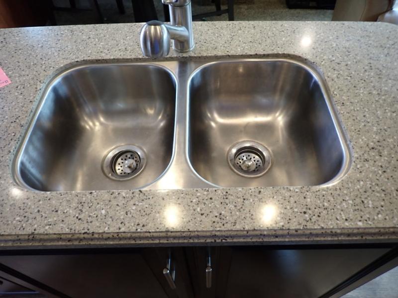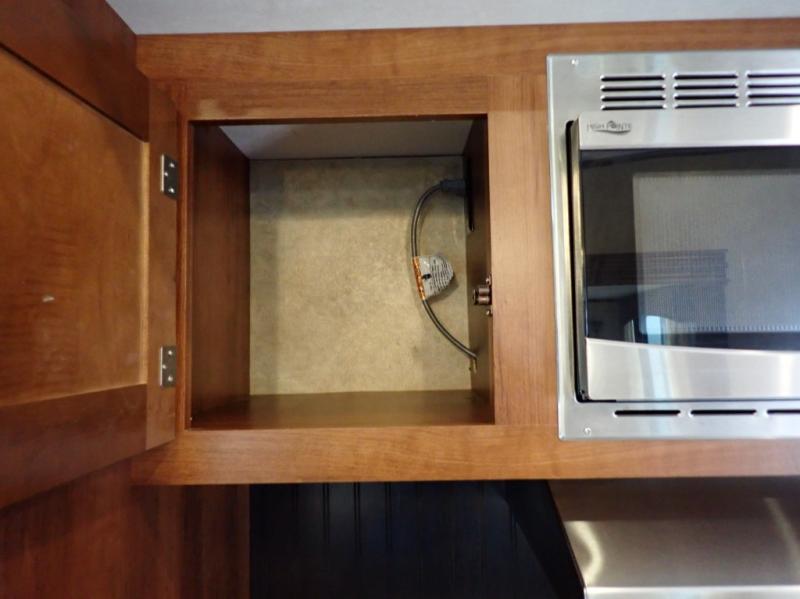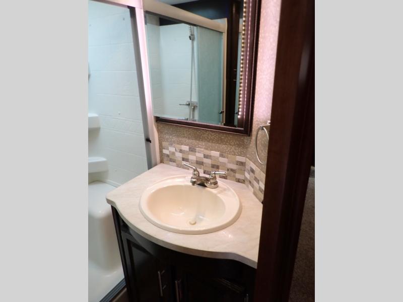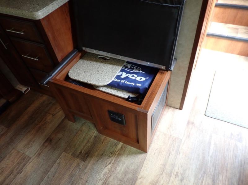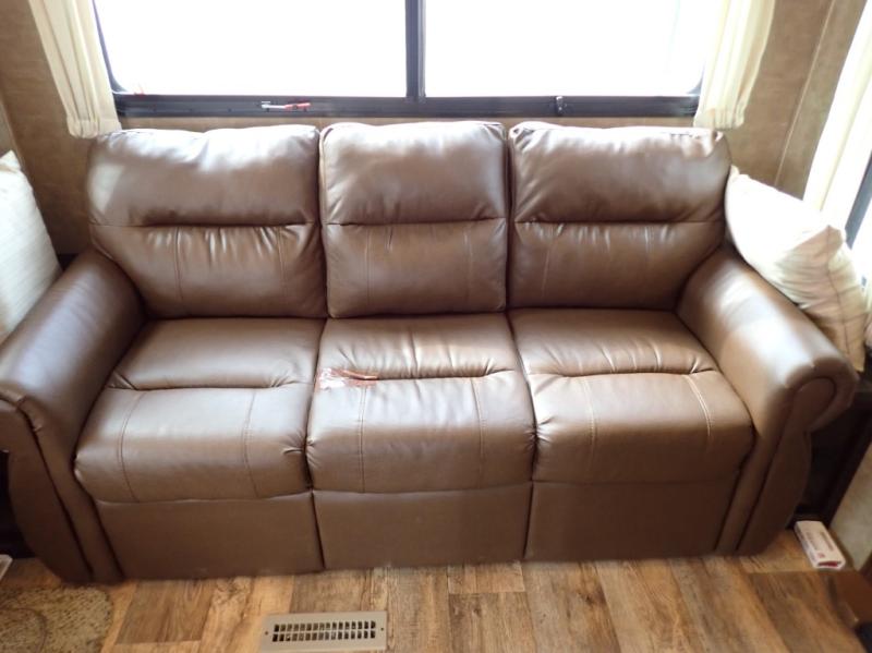 Head back towards the kitchen and living area and you will notice how open and spacious it feels with two slides. One slide has a booth dinette and a theater sofa. On the opposite slide there is a refrigerator, pantry, three burner range, microwave, second pantry, and an entertainment center with fireplace. Adjacent to the slide there is a hutch, bench, and overhead cabinets. In the middle of the kitchen you will find extra counter space with the island as well as the double kitchen sink and ceiling fan.