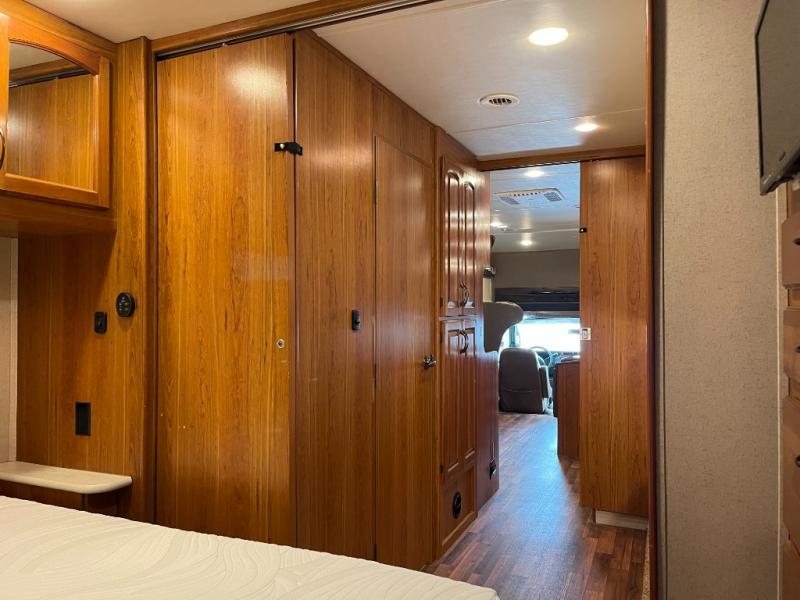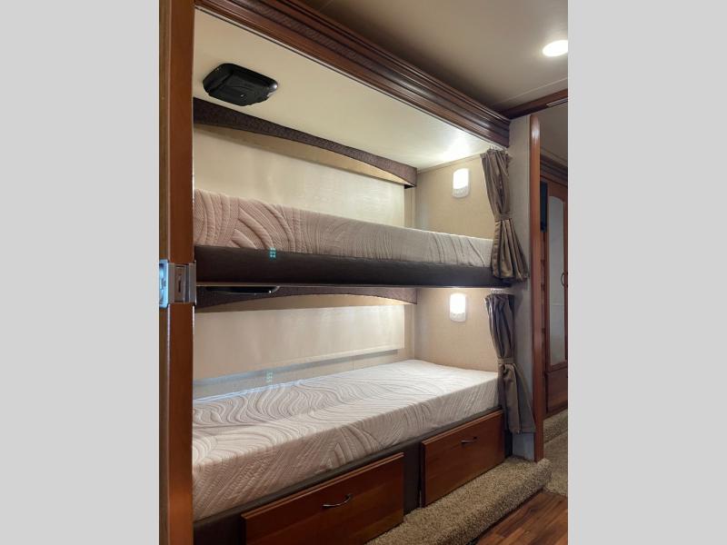 As you proceed toward the back of the motor home, you will find the bathroom and bedroom. The bathroom has a sink, medicine cabinet, toilet, and shower. The bedroom offers a queen bed and nightstands. There is one more slide with a wardrobe and bunk beds.