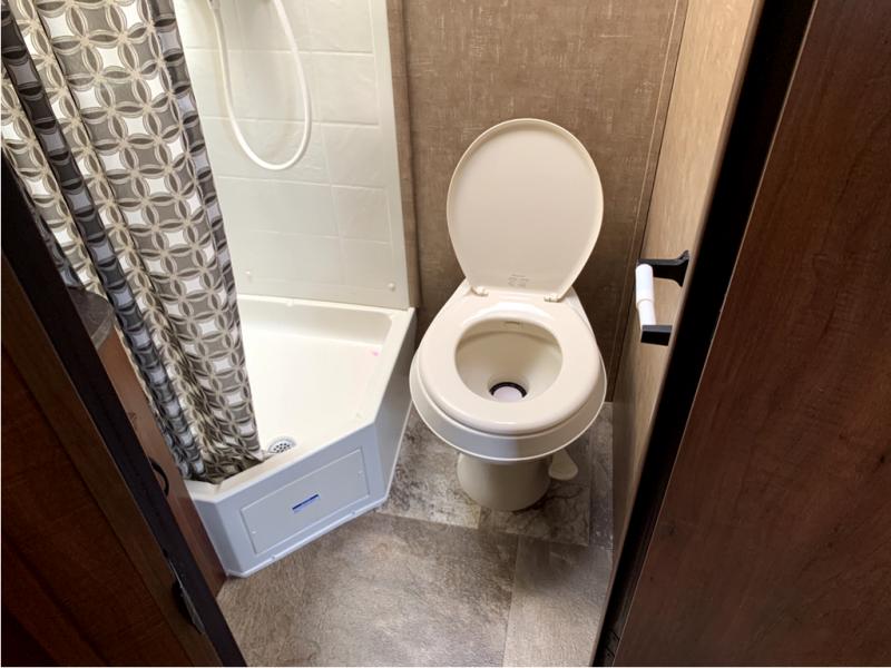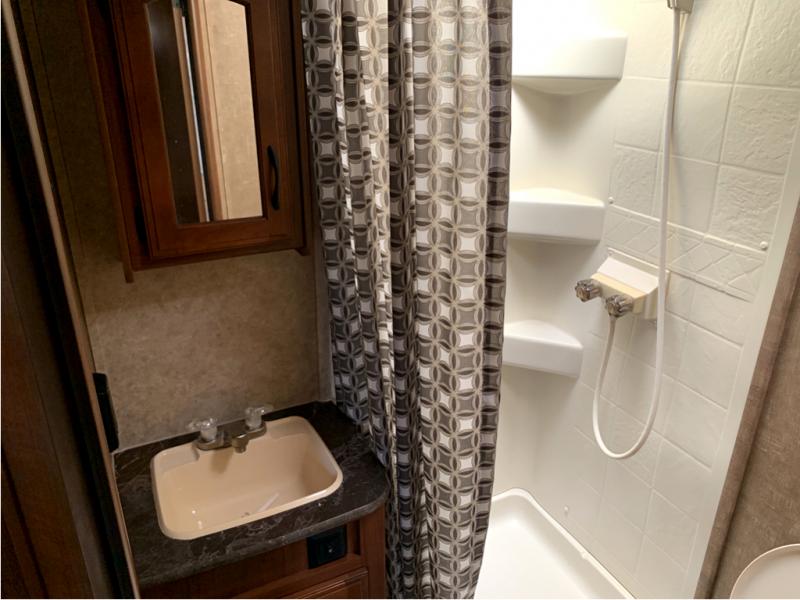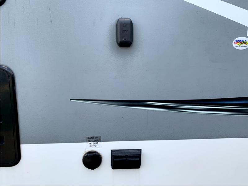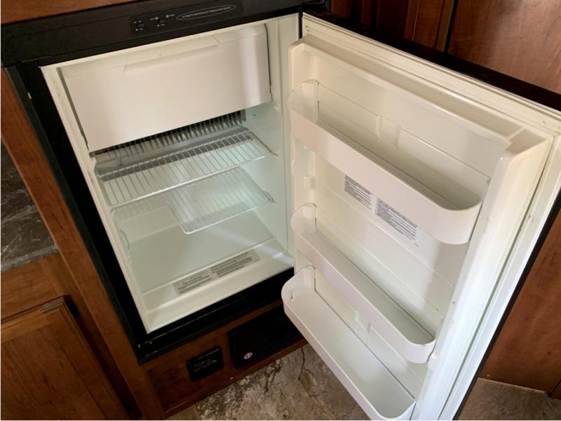 A sofa with overhead storage is across from the dinette. A TV is located in between the dinette and sofa for easy viewing from all the seats in the living/kitchen area. The refrigerator is across from the pantry.