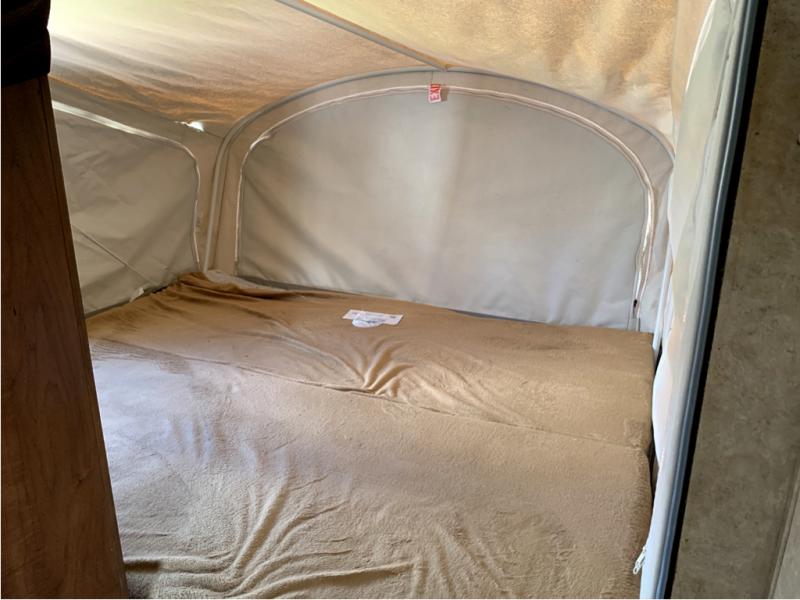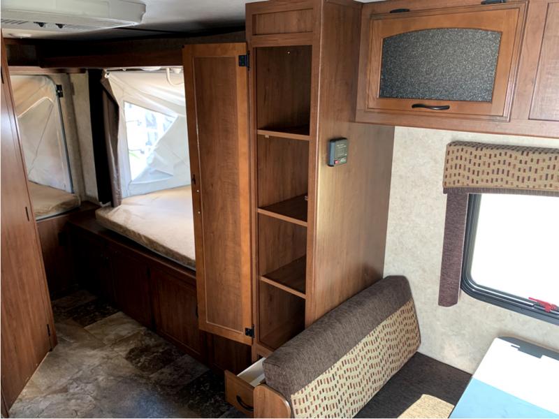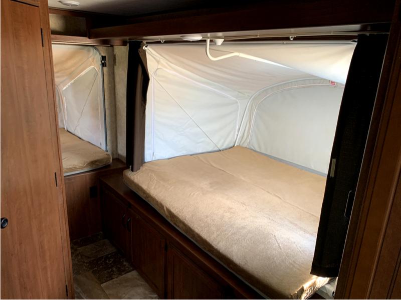 As you enter the trailer to the right, a curtain separates the front bedroom from the the rest of the trailer. There is a queen bed with overhead cabinets along the front wall.