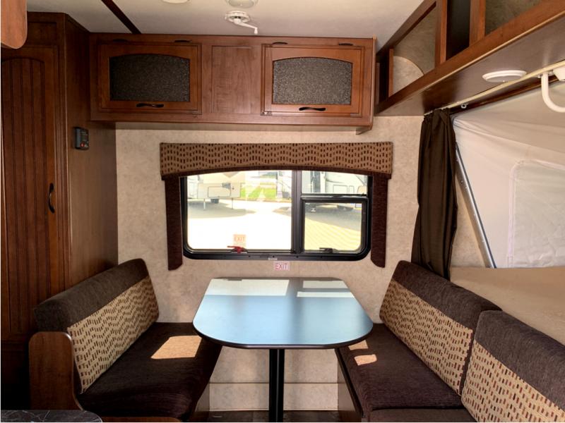 On the opposite side is a pantry, two burner range with overhead microwave oven, a large kitchen sink, countertop space, and a booth dinette. There are also overhead cabinets for storing your dishes and pots and pans over the sink and the dinette.
