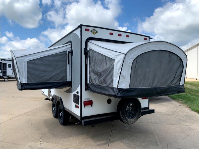 The Jay Feather 7 model 20RL travel trailer by Jayco features a rear kitchen/living space with a sofa and dinette, and front queen bed, plus more!