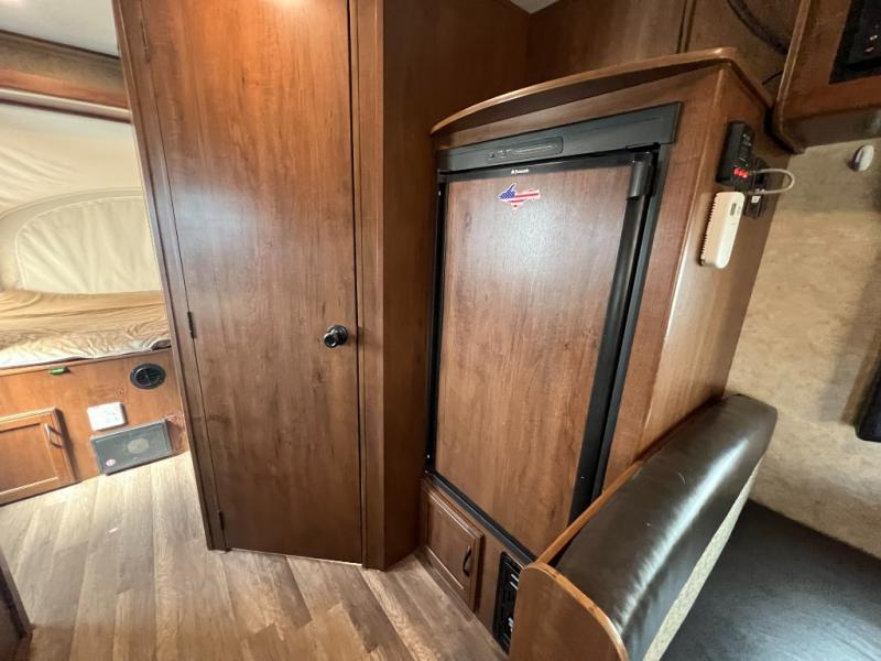 On the opposite side of the expandable you will find a dinette with overhead storage, refrigerator, and a TV shelf.