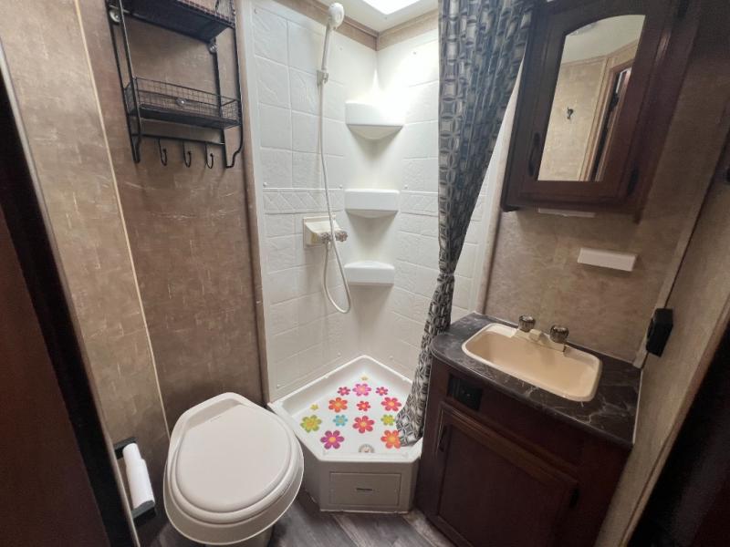 The bathroom is located in the rear. The bathroom has a toilet, corner shower, and a sink.