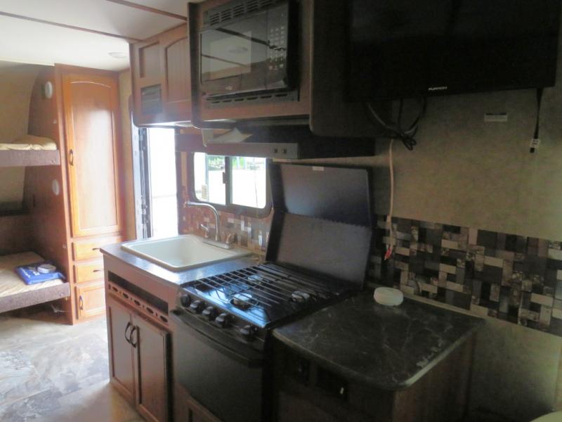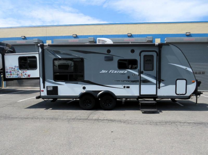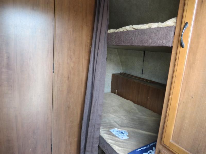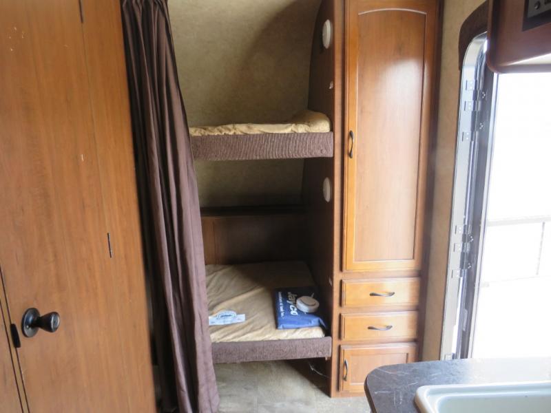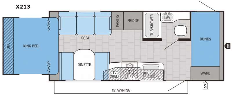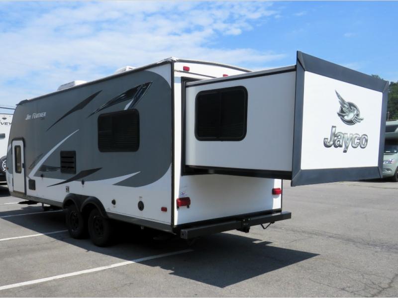 The Jay Feather X213 expandable by Jayco offers bunk beds and a rear king bed slide.