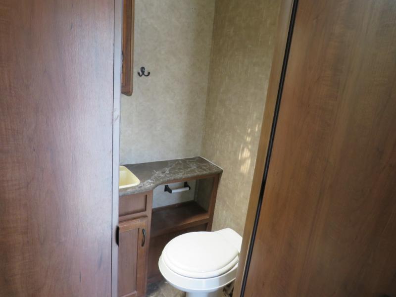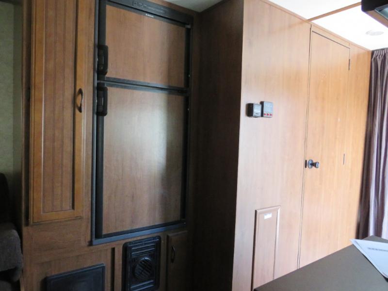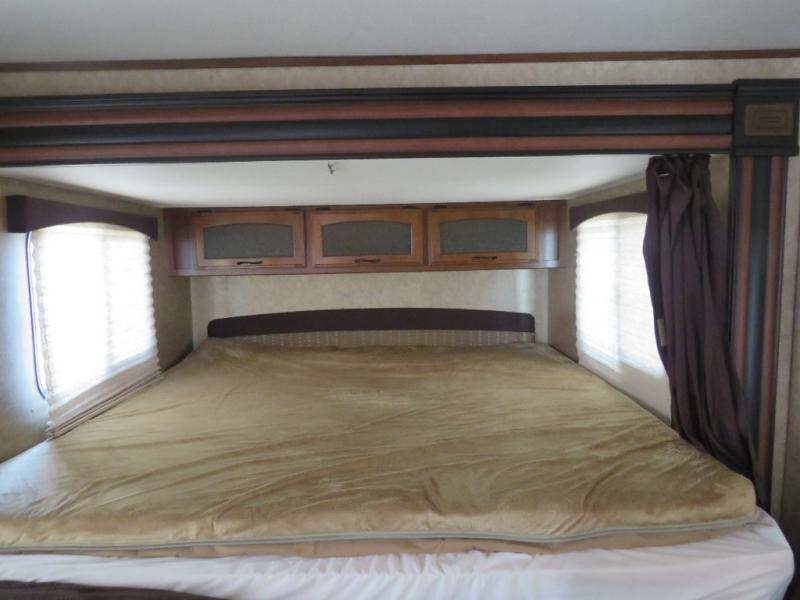 The rear king bed slide includes overhead cabinets at the head of the king bed. If you need some privacy, there is with a curtain between to close off the bed area from the living/dining space.