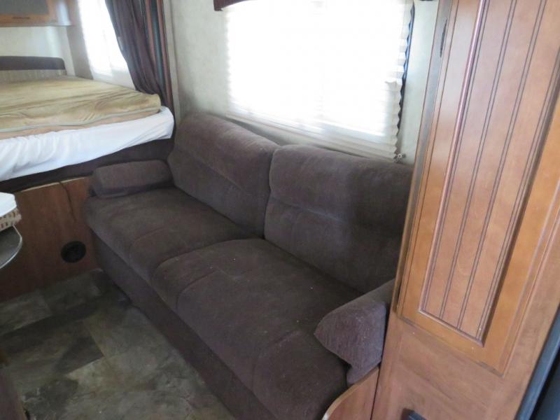 Along the road side you will find a refrigerator, pantry, and a sofa. The opposite side has a dinette, TV shelf, microwave, three burner range, and a kitchen sink.